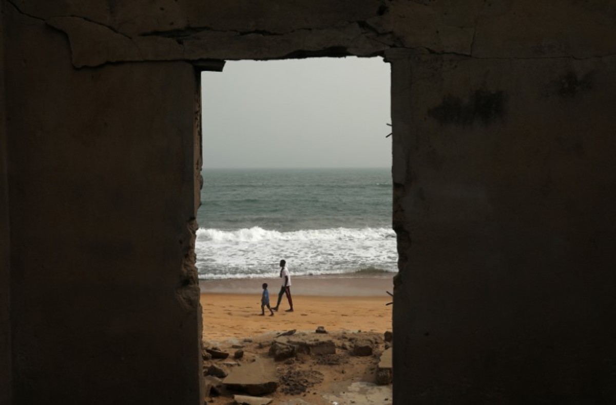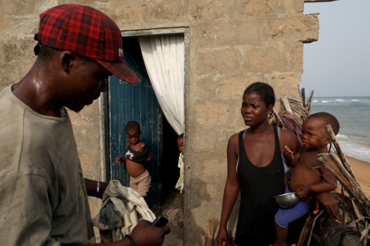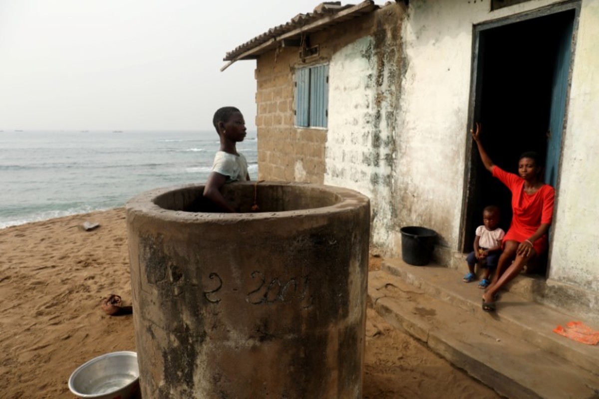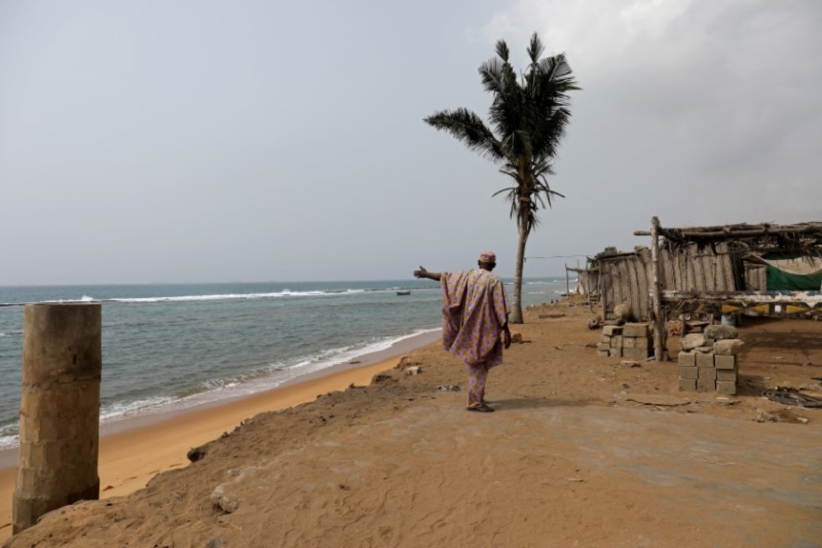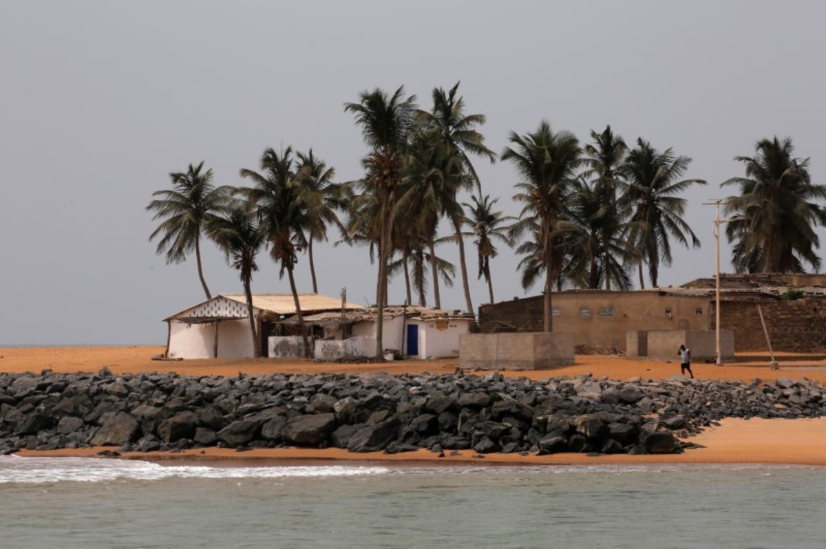 FILE PHOTO: Massi Natou, 46, collects water from a well on a coastline that is threatened by sea storms and coastal erosion in Afidegnigban, a suburb of Lome, Togo, February 28, 2020. REUTERS/Luc GnagoA boat passes by the remains of a costal road that has fallen into the sea due to coastal erosion in Lome, Togo, February 16, 2020. REUTERS/Luc GnagoAfenou Agnes, 58, a resident of Baguida, who was given money in 2014 by the government to be rehoused in Tropicana, sits in her home in Baguida, a suburb of Lome, Togo, February 28, 2020 after returning to Baguida after the funds ran out. REUTERS/Luc GnagoWoollams Ablavi, 61, who was given money in 2014 by the government to be rehoused when she said her property was destroyed by coastal erosion but returned to Baguida when the money ran out, hangs clothes up to dry at her home in Baguida, a suburb of Lome, Togo, February 28, 2020. In 2014. REUTERS/Luc GnagoAfanubo Hollalie Olivia, 27, her husband Agbe Sanvi, 32, and their three children, all of whom are residents of Baguida, stand by their home that was damaged by storms and they say is threatened with destruction by coastal erosion in Baguida, a suburb of Lome, Togo, February 29, 2020. REUTERS/Luc GnagoTogbui Doevi Jean Dorllayi II, 63, the chief of Doevikope in Baguida, demonstrates where the sea line used to be, while walking along the beach that he says has been damaged by coastal erosion, in Baguida, a suburb of Lome, Togo, February 28, 2020. REUTERS/Luc GnagoThe sea is seen from part of the ruined house of former Chief of Afidegnigban, Kokou Denis Apedo, on the sandy beaches of Afidegnigban, a suburb of Lome, that are being lost through coastal erosion and sea storms in Togo, February 16, 2020. REUTERS/Luc GnagoJacob Amedrana, 47, who said he had to leave his home as it was destroyed by coastal erosion, sweeps the floor in front of his temporary home which is now also under threat of coastal erosion, in Baguida, Togo, February 25, 2020. REUTERS/Luc GnagoRocks and stones that are intended to protect the beach from coastal erosion are seen on the beach front in Aneho, Togo, February 26, 2020. REUTERS/Luc GnagoMarie Ma Joie Gami, 26, sits with her daughter Sarah Tamakloe, 1, by the front door to their home, which they say is under threat from coastal erosion as they talk with a friend in Baguida, a suburb of Lome, Togo, February 25, 2020. REUTERS/Luc GnagoThe window of an abandoned bar is seen on the coast where many of the population have moved away from the sandy beaches that are being lost through coastal erosion and sea storms in Afidegnigban, a suburb of Lome, Togo February 25, 2020. REUTERS/Luc GnagoPeople walk past boats abandoned on the beach where the port of Lome can be seen in the distance in Lome, Togo, February 29, 2020. REUTERS/Luc GnagoTogbui Doevi Jean Dorllayi II, Chief of Doevikope, 63, sits in his temporary home, a makeshift shelter made of straw and planks in Baguida a suburb of Lome, Togo, while he is building a new home 100 yards inshore from his former property that he says has been destroyed by coastal erosion and sea storms, February 26, 2020. REUTERS/Luc GnagoThe remains of an abandoned house are seen on the coast of Afidegnigban a suburb of Lome, Togo where many of population have moved away from the sandy beaches as they are being lost through coastal erosion and sea storms, February 16, 2020. REUTERS/Luc GnagoAssah Kokou Akpebiotor 70, smokes as he looks out to sea from the coastal village of Baguida, a suburb of Lome from where many of population have moved away from their homes on the sandy beaches which he says are being lost through coastal erosion and sea storms in Togo, February 27, 2020. REUTERS/Luc GnagoThe remains of an abandoned bar are seen on the coast of Afidegnigban, a suburb of Lome, Togo, where many of the population have moved away from their homes on the sandy beaches that are being lost through coastal erosion February 16, 2020. REUTERS/Luc GnagoThe sea is seen through a window of an abandoned house on the sandy beach of Afidegnigban, a suburb of Lome, which are being lost through coastal erosion and sea storms in Togo, February 16, 2020. REUTERS/Luc GnagoTogbui Doevi Jean Dorllayi II, 63, the chief of Doevikope in Baguida, talks on his mobile during a private business meeting in Baguida, a suburb of Lome, Togo, February 27, 2020. REUTERS/Luc GnagoPeople walk past the remains of a house that was destroyed by coastal erosion and sea storms in Afidegnigban, Lome, Togo, February 16, 2020. REUTERS/Luc GnagoLucien Kpondji, 54, a resident of Afidegnigban, holds an old black and white photograph of his father Azonsou Kpondji, his grandfathers, relatives and friends, in Afidegnigban, a suburb of Lome, Togo, February 28, 2020. REUTERS/Luc GnagoWaves crash against former stairs of a building swept away by the sea on the sandy beaches that are being lost through coastal erosion and sea storms in Baguida, a suburb of Lome, Togo February 17, 2020. REUTERS/Luc GnagoTogbui Doevi Jean Dorllayi II, Chief of Doevikope, 63, works on his kitchen garden next to his temporary home in Baguida a suburb of Lome, Togo, while he is building a new home 100 yards inshore from his former property that he says has been destroyed by coastal erosion February 26, 2020. REUTERS/Luc GnagoFishermen repair their nets on the sandy beach of Aneho, Togo, which is under threat from coastal erosion February 26, 2020. REUTERS/Luc GnagoThe sea is seen from the windows of the ruined house of former Chief of Afidegnigban, Kokou Denis Apedo, on the sandy beaches of Afidegnigban, a suburb of Lome, that are being lost through coastal erosion and sea storms in Togo, February 16, 2020. REUTERS/Luc GnagoAdjahi Komlan, a grandson of former Chief of Afidegnigban Mr Koukou Denis Apedo, looks out to sea from the ruins of his grandfather's house which was built on sandy beaches that are being lost through coastal erosion and sea storms in Afidegnigban a suburb of Lome, Togo February 25, 2020. REUTERS/