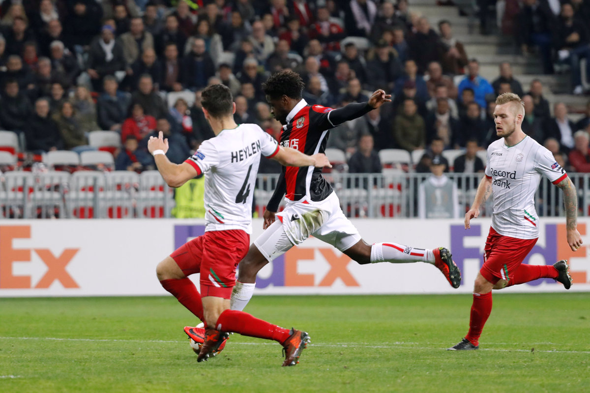 Italian Mario Balotelli scored twice, including a penalty, for Nice as they went through from Group K with a 3-1 victory over Belgium's Zulte Waregem.