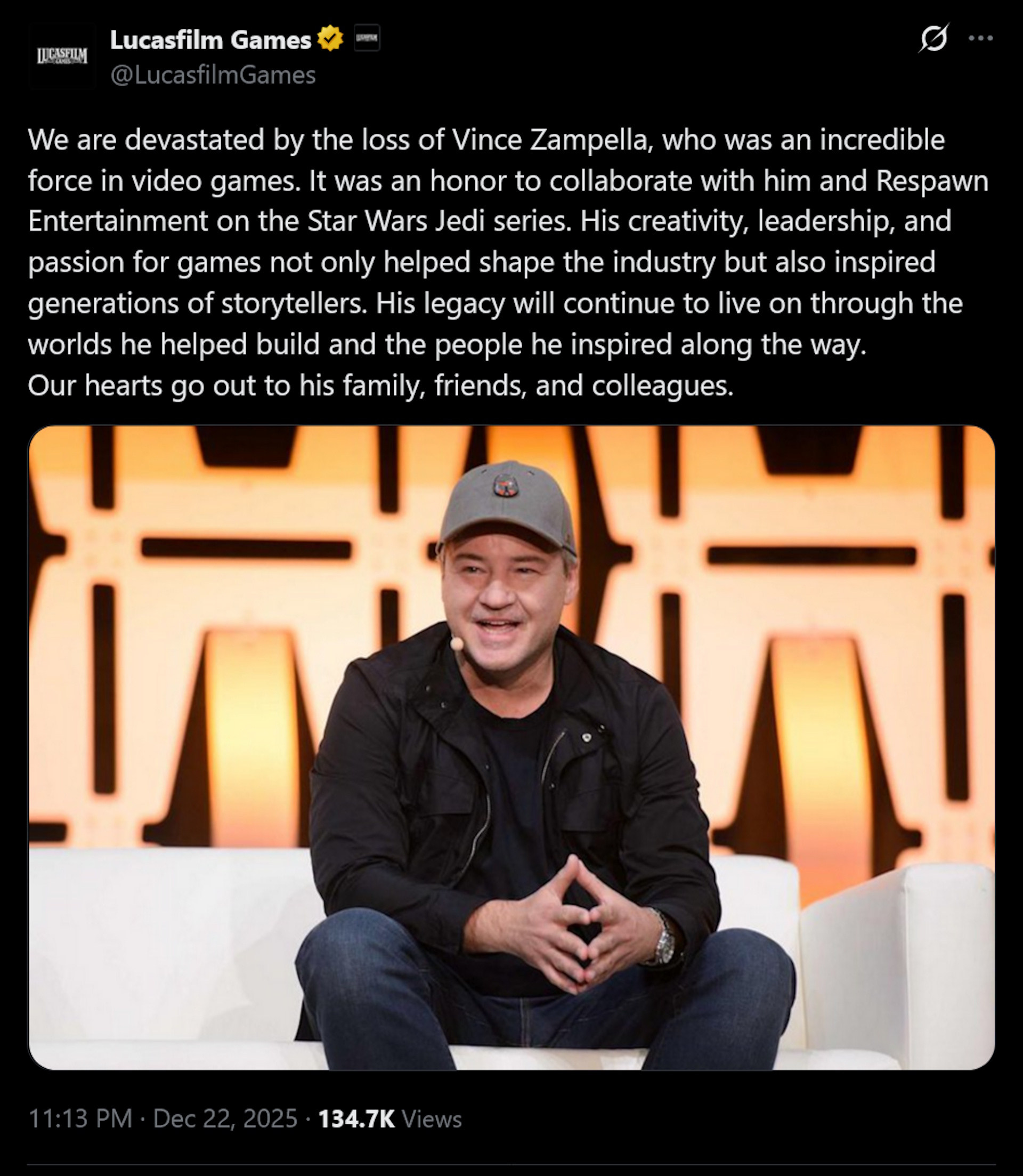 We're heartbroken by the passing of our founder and dear friend Vince Zampella.Vince was a titan and legend of this industry, a visionary leader and a force who shaped teams and games like Call of Duty, Titanfall, Apex Legends, the Star Wars Jedi series and Battlefield for our… pic.twitter.com/L51gG9tbRoDecember 22, 2025