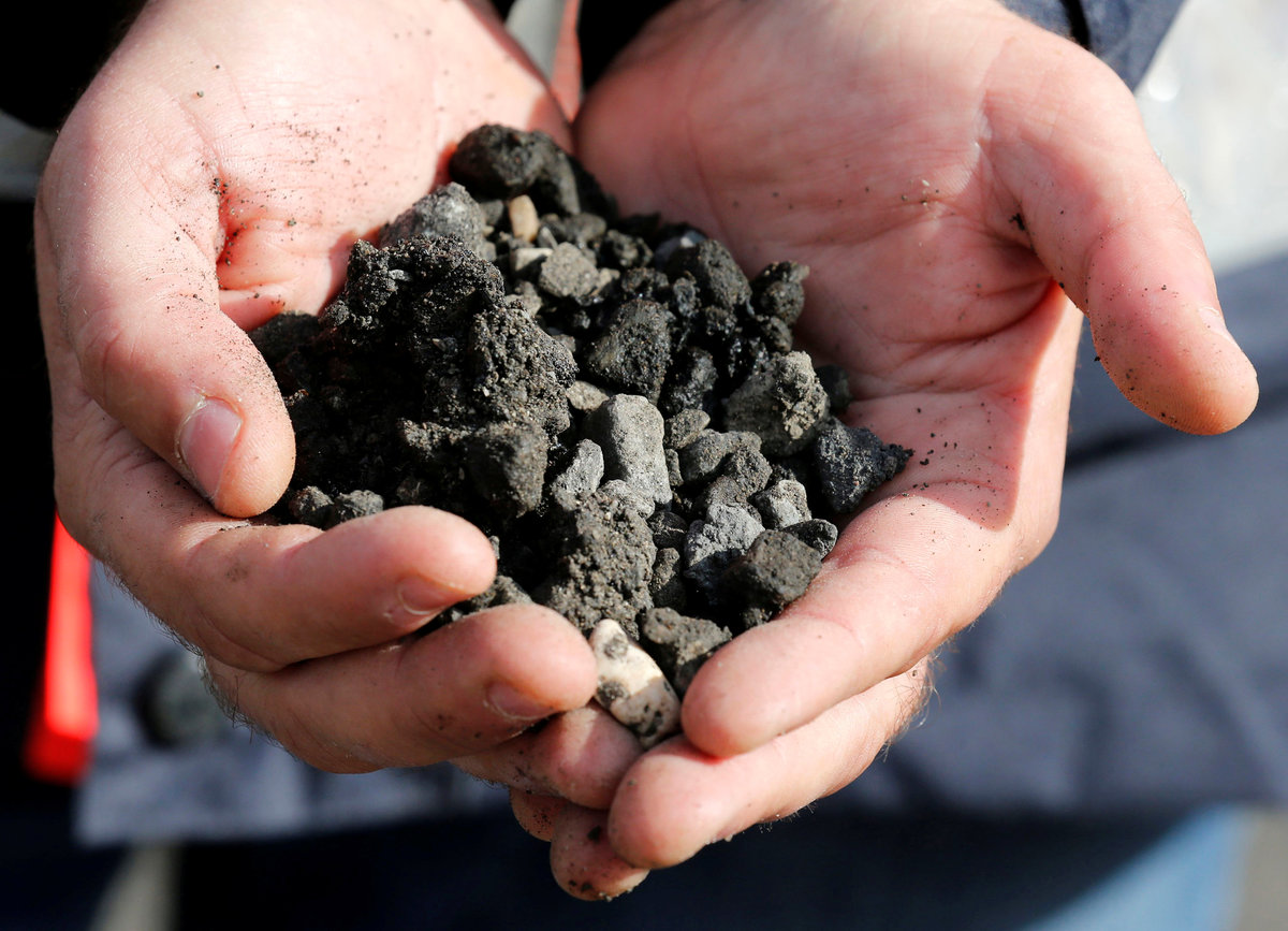 An employee holds recycled asphalt during a visit a a mobile factory installed to produce tons of recycled asphalt near the A10 motorway in Gironde for a test for the first "100% recycled" road by Eurovia, in collaboration with Vinci Autoroute, as part of a 1 km section renovation project, in Saint-Christoly-de-Blaye, France, October 9, 2018. Eurovia inaugurated its "ecological" route, a world first, containing 100% recycled materials. REUTERS/Regis Duvignau