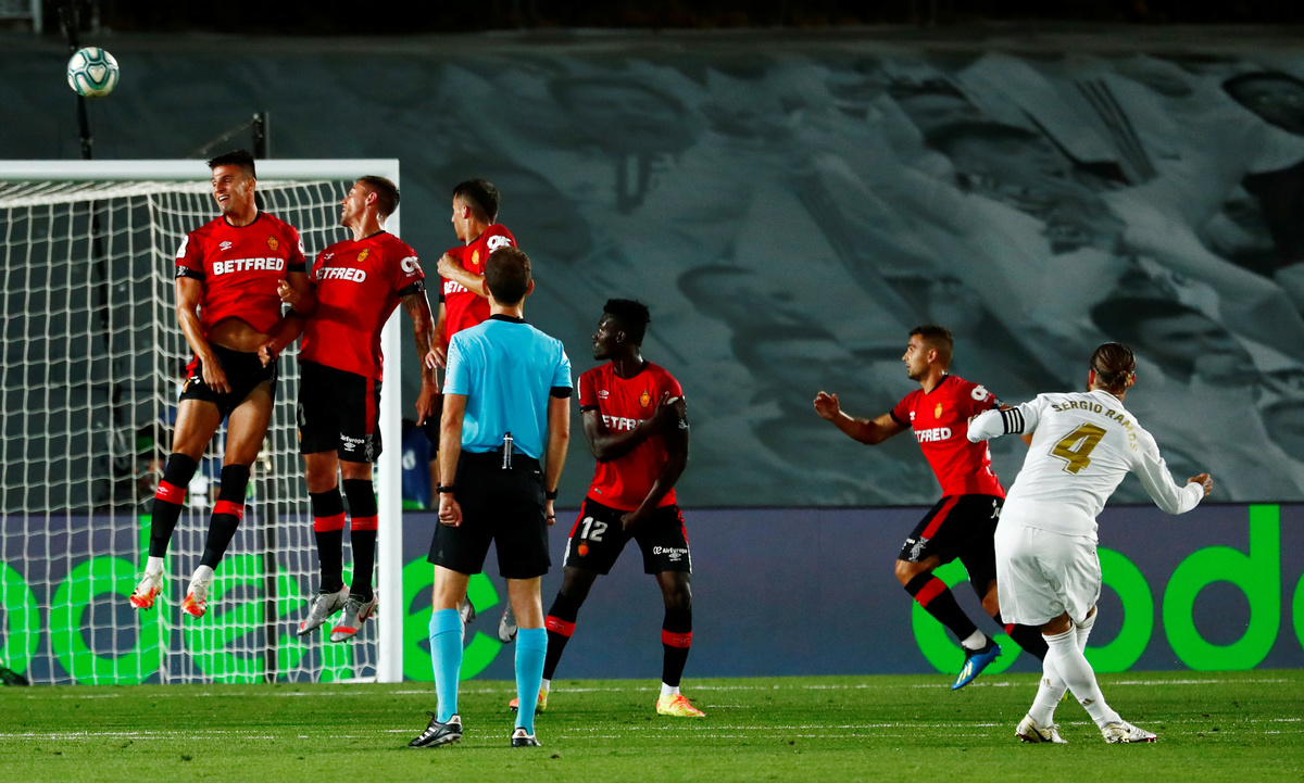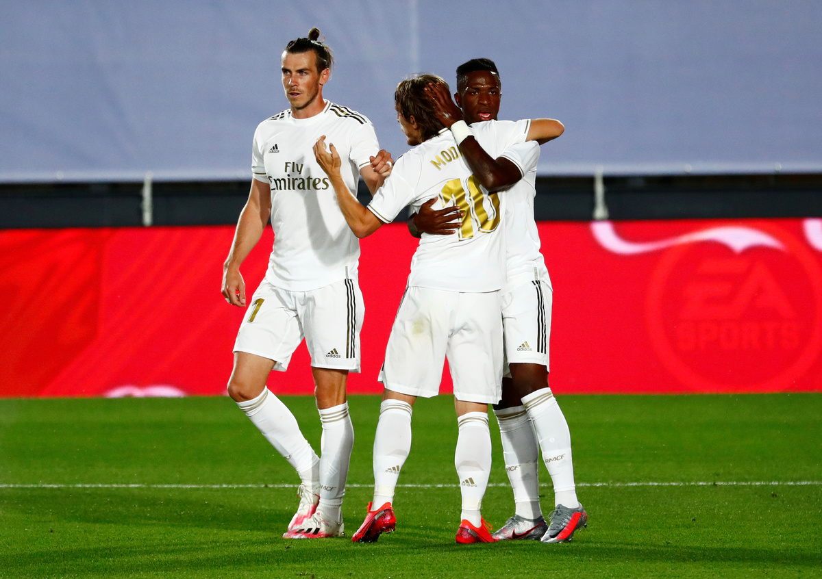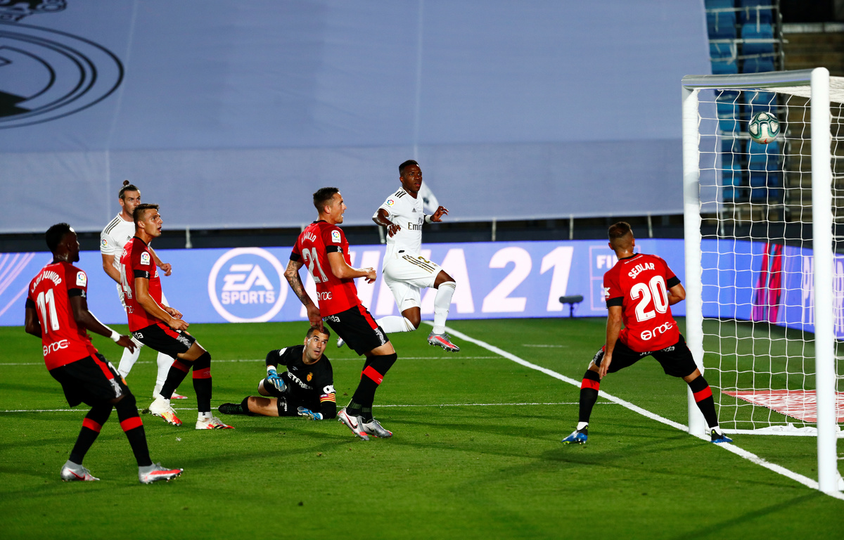 Soccer Football - La Liga Santander - Real Madrid v Real Mallorca - Alfredo Di Stefano Stadium, Madrid, Spain - June 24, 2020 Real Madrid's Vinicius Junior celebrates scoring their first goal with teammates, as play resumes behind closed doors following the outbreak of the coronavirus disease (COVID-19) REUTERS/Susana VeraSoccer Football - La Liga Santander - Real Madrid v Real Mallorca - Alfredo Di Stefano Stadium, Madrid, Spain - June 24, 2020 Mallorca's Ante Budimir in action with Real Madrid's Raphael Varane, as play resumes behind closed doors following the outbreak of the coronavirus disease (COVID-19) REUTERS/Susana VeraSoccer Football - La Liga Santander - Real Madrid v Real Mallorca - Alfredo Di Stefano Stadium, Madrid, Spain - June 24, 2020 Real Madrid's Sergio Ramos celebrates scoring their second goal, as play resumes behind closed doors following the outbreak of the coronavirus disease (COVID-19) REUTERS/Susana VeraSoccer Football - La Liga Santander - Real Madrid v Real Mallorca - Alfredo Di Stefano Stadium, Madrid, Spain - June 24, 2020 Real Madrid's Sergio Ramos scores their second goal, as play resumes behind closed doors following the outbreak of the coronavirus disease (COVID-19) REUTERS/Susana VeraSoccer Football - La Liga Santander - Real Madrid v Real Mallorca - Alfredo Di Stefano Stadium, Madrid, Spain - June 24, 2020 Real Madrid's Sergio Ramos in action with Mallorca's Dani Rodriguez, as play resumes behind closed doors following the outbreak of the coronavirus disease (COVID-19) REUTERS/Susana Vera