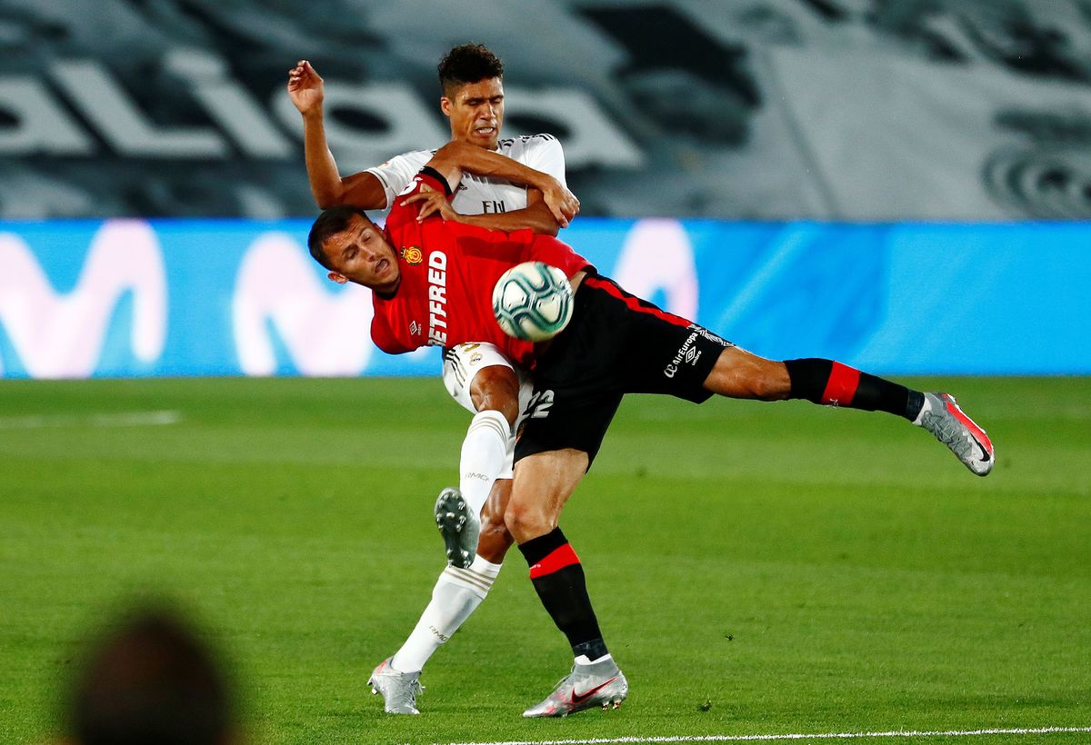 Soccer Football - La Liga Santander - Real Madrid v Real Mallorca - Alfredo Di Stefano Stadium, Madrid, Spain - June 24, 2020 Real Madrid's Karim Benzema in action with Mallorca's Martin Valjent, as play resumes behind closed doors following the outbreak of the coronavirus disease (COVID-19) REUTERS/Susana Vera