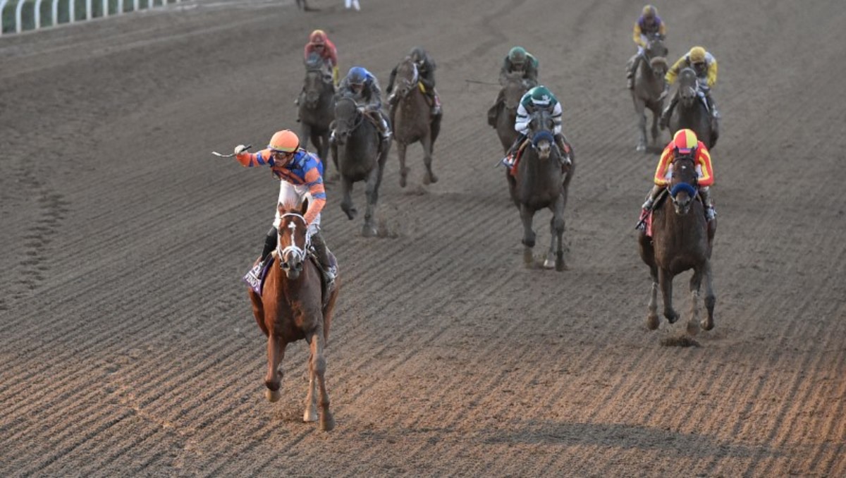 Mongolian Groom (15-1) was in contention early in the 11-horse race on the fast dirt surface but slowed near the top of the final stretch.