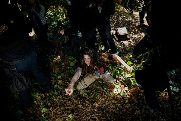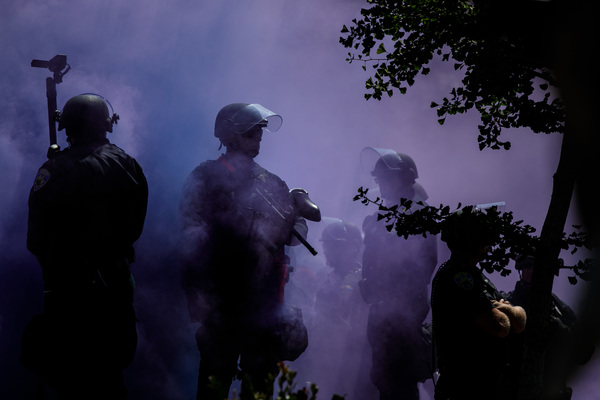 Police in riot gear fired a rubber bullet at one demonstrator who attempted to cross a barricade into the park, which was closed to the public. Some protesters set off purple smoke bombs.