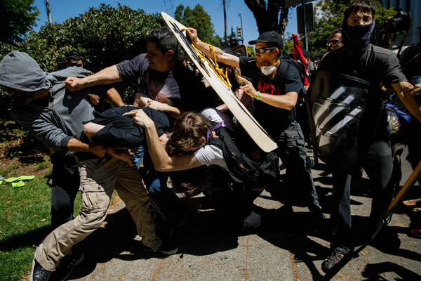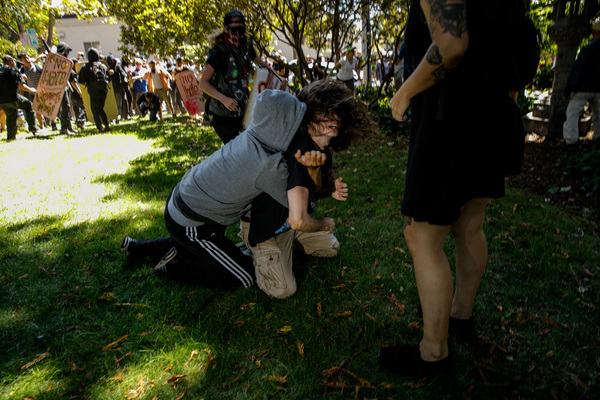 Moderate counterprotesters were upset with the violence. "We need to get antifa out of here," said one man, who helped break up a fight.