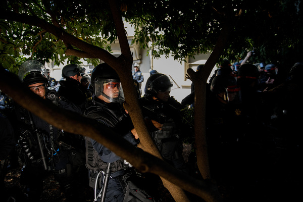 By 2 p.m., several thousand people were gathered in the park and tensions remained high. At least 10 people had been arrested, police said.