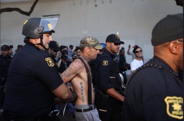 There were shoving matches around well-known Orange County far-right figure Johnny Benitez. Some screamed "Go home Nazi," as police tried to escort Benitez and Irma Hinojosa, a member of the Southern California group Latinos for Trump, through the crowd and out of the park.