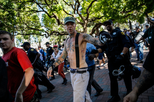 The mostly peaceful demonstration started heating up about noon at Martin Luther King Civic Center Park, where the two rival groups faced off and several fights broke out.