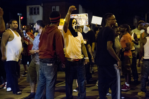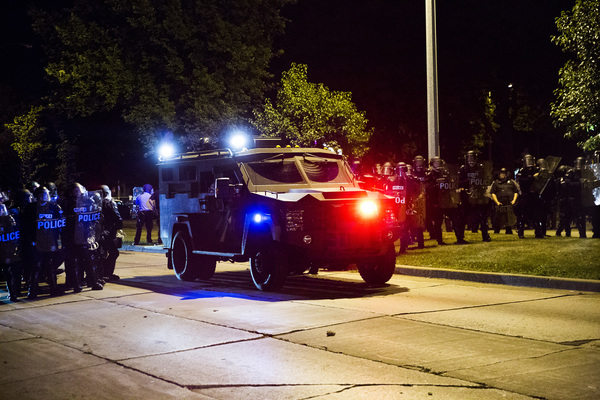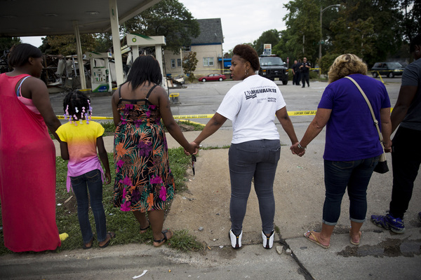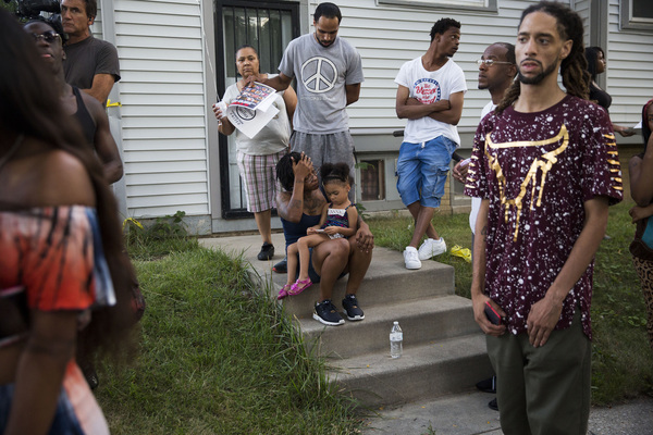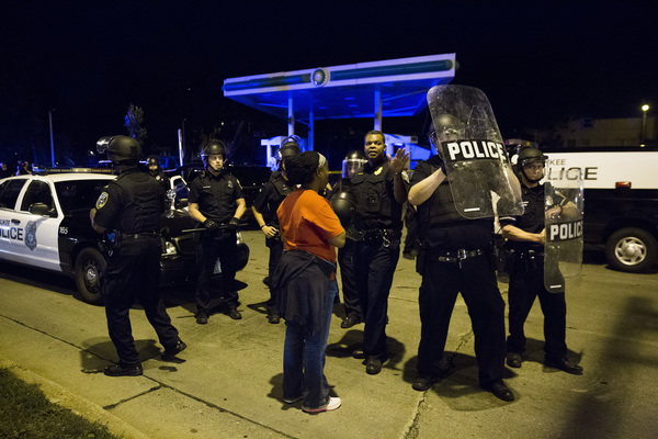 Earlier in the evening, more than 100 people gathered near the scene at N. 44th St. and W. Auer Ave. and at times pushed against a line of 20 to 30 officers, some of whom were in riot gear.