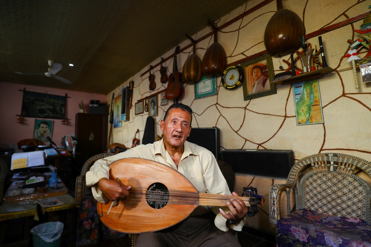 Palestinian musician Khader El-Bayed, who turned his house into a music hub, plays a stringed instrument in Gaza City, November 7, 2021. Picture taken November 7, 2021. REUTERS/Mohammed Salem