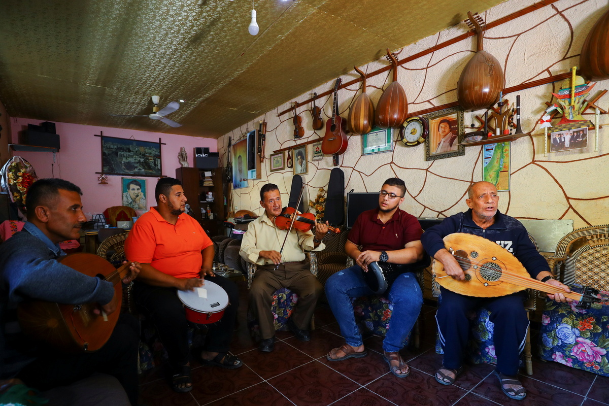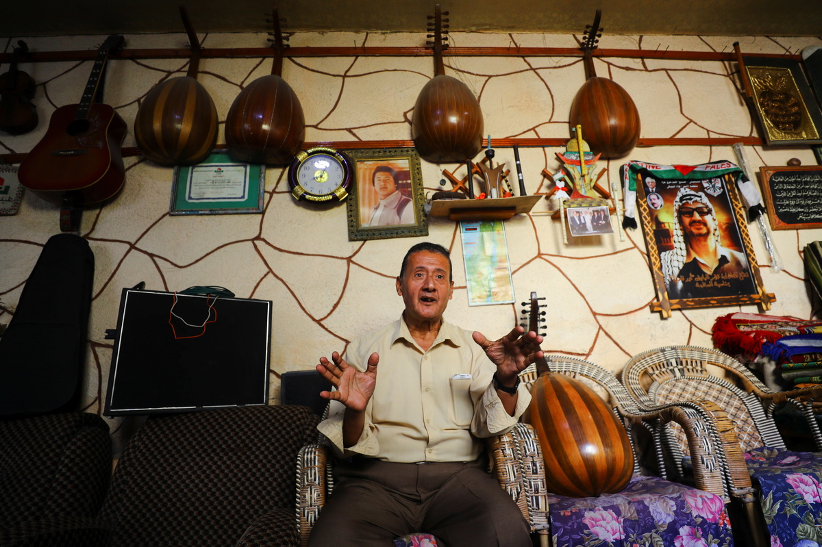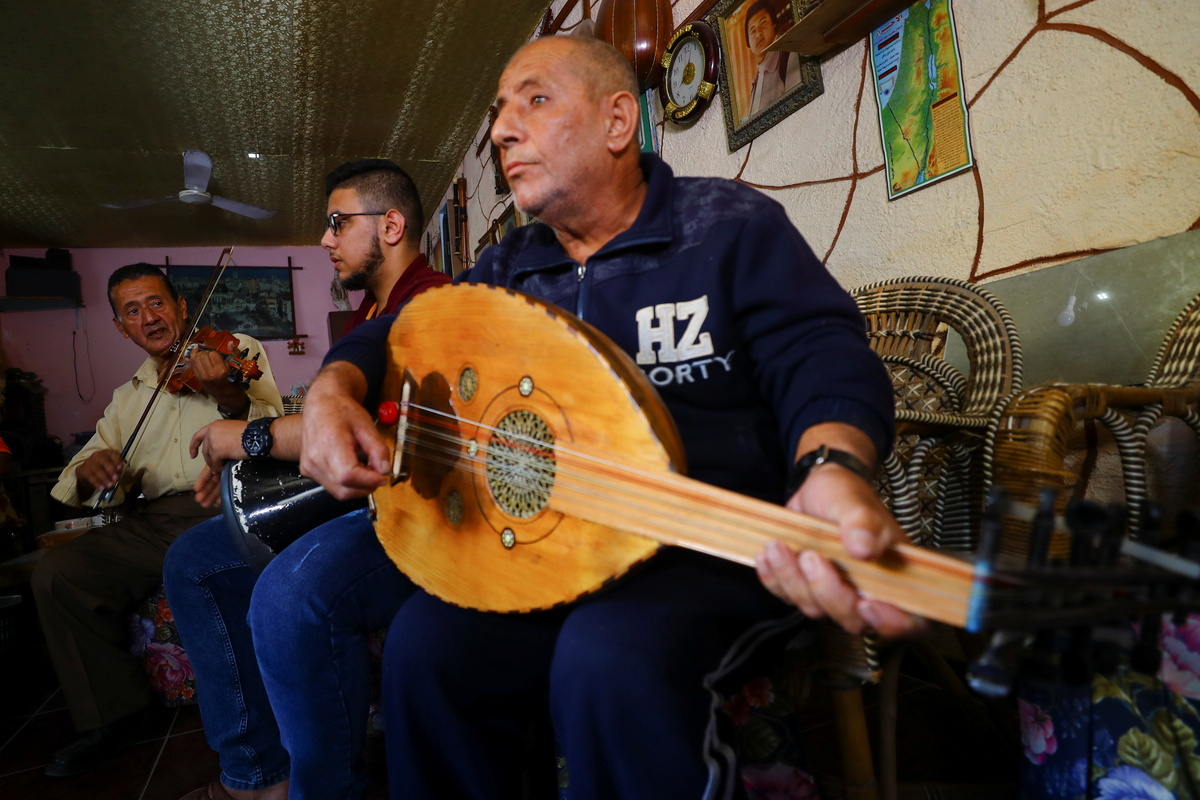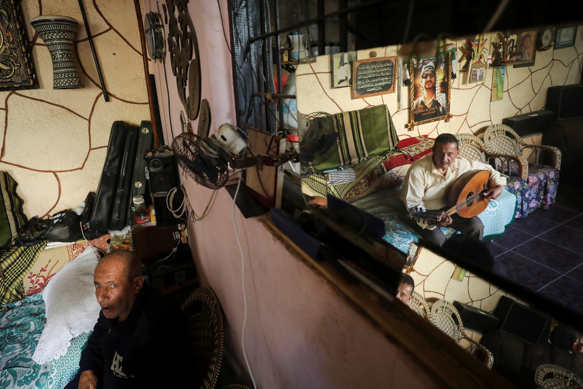 Palestinian musician Khader El-Bayed, who turned his house into a music hub, is reflected in a mirror as he plays a stringed instrument in Gaza City, November 7, 2021. Picture taken November 7, 2021. REUTERS/Mohammed SalemPalestinian musician Khader El-Bayed, who turned his house into a music hub, talks during an interview in Gaza City, November 7, 2021. Picture taken November 7, 2021. REUTERS/Mohammed SalemPalestinian musician Khader El-Bayed, who turned his house into a music hub, trains men how to use music instruments in Gaza City, November 7, 2021. Picture taken November 7, 2021. REUTERS/Mohammed Salem