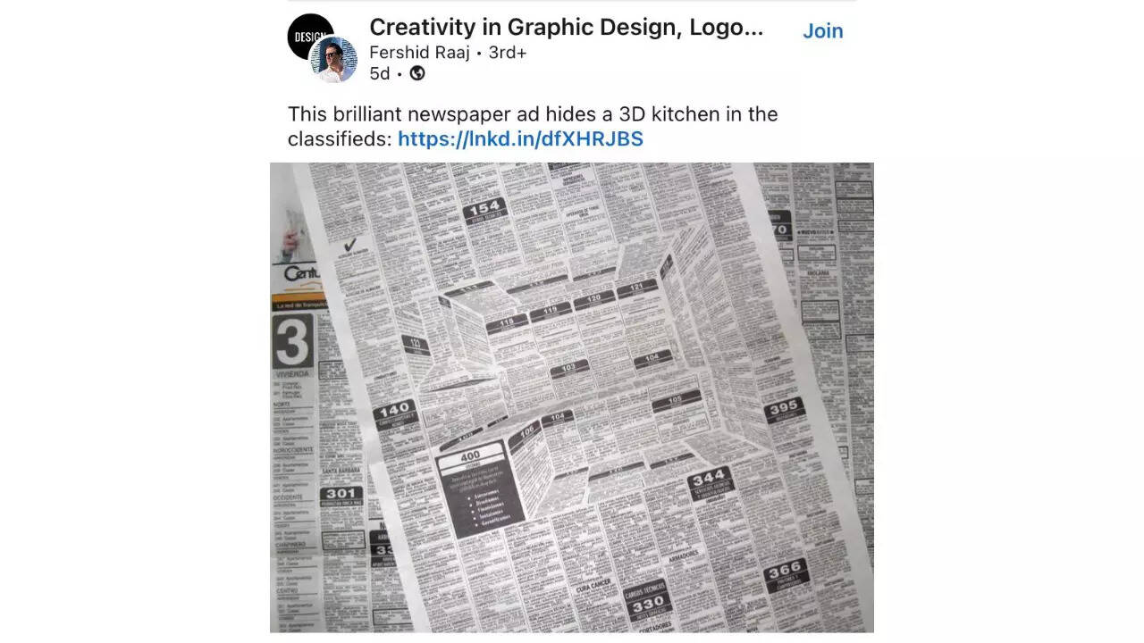 The ad's clever use of design techniques creates a visual perception of depth and dimension, making it appear as though there is a three-dimensional kitchen within the classified section. By using optical illusions, the designers created something visually striking and attention-grabbing. Optical illusions are a powerful tool used in advertising to engage and intrigue audiences. They can take various forms, including billboards, commercials, package designs, and promotional products.