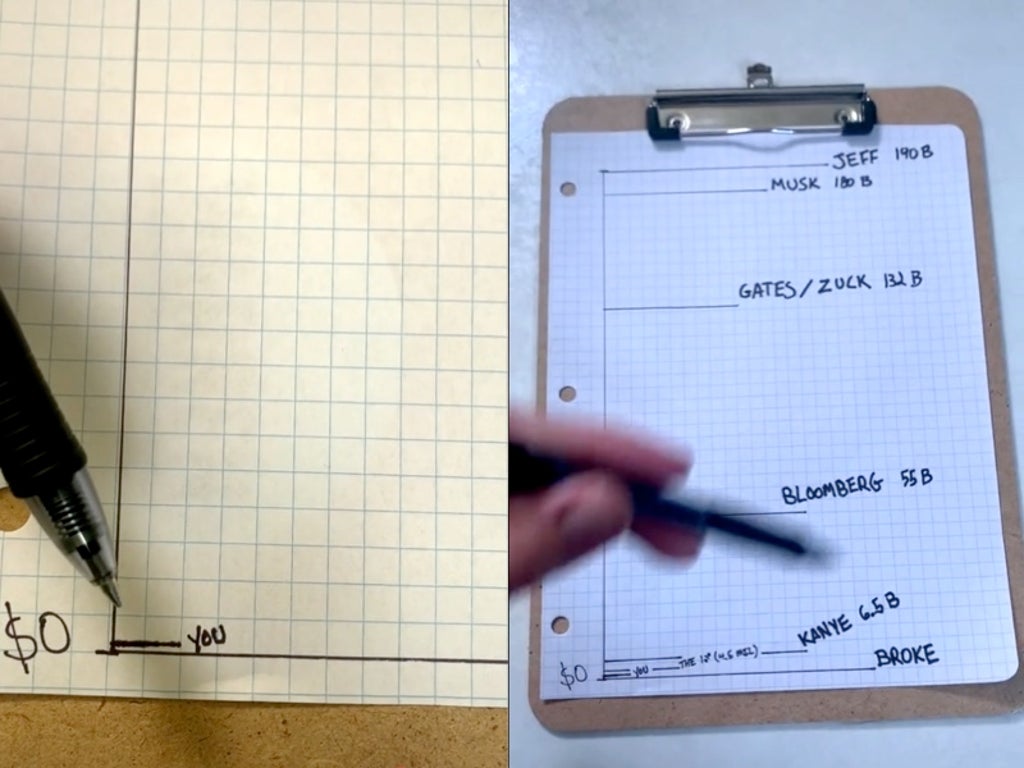 The clip sees Russell move on to billionaires at “a whole other level,” including Tesla CEO Elon Musk, with a net worth of $180bn, which places him at a line near the top of the graph, and tech founders Bill Gates and Mark Zuckerberg with net worths of $132bn, who are illustrated much lower but still way above the middle of the graph.