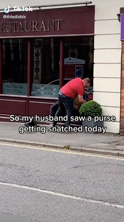 The video, which was captured a shared by Nicole, who users the handle @thisdizbiz, shows her husband Darren Brownson taking matters into his own hands after seeing a woman have her bag stolen by a petty thief in Farnham, Surrey.