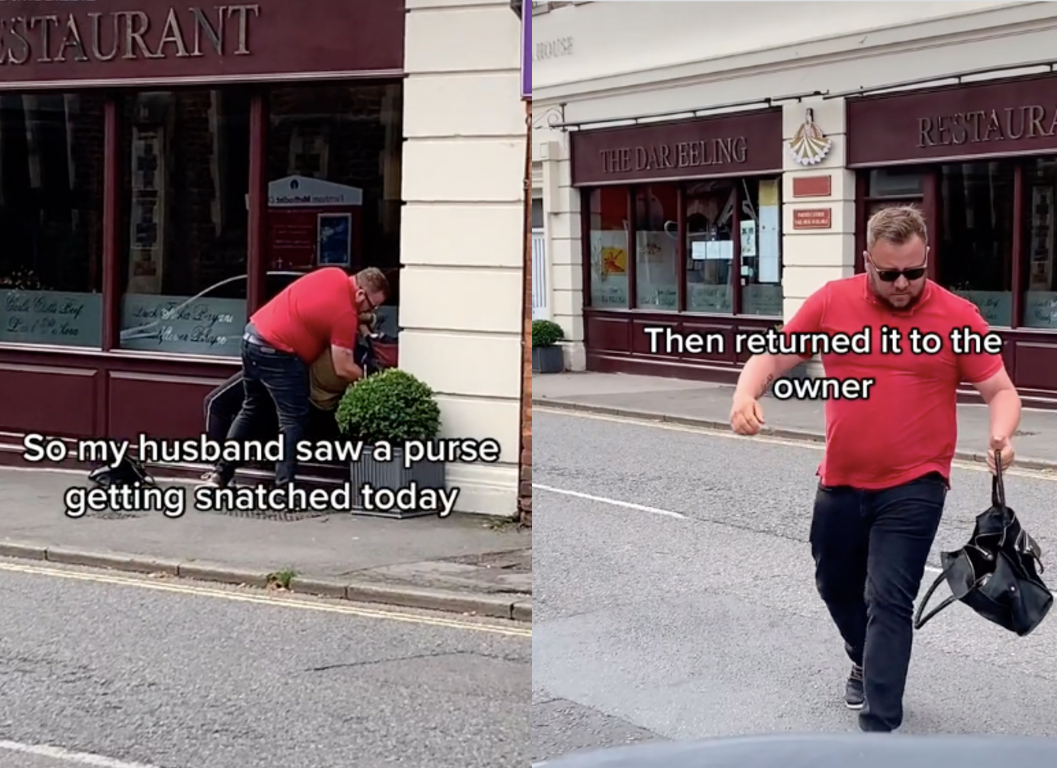 A viral TikTok video, that has been viewed more than five million times, shows a man apprehending a thief who stopped a bag snatcher in the street and returned the item to its owner.