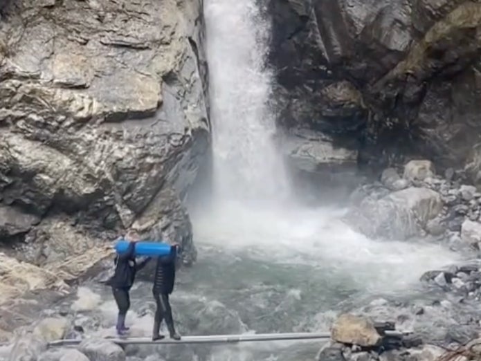 Next, you see two of them gracefully balancing on a pole across a breathtaking waterfall as they carry oxygen cylinders above them.