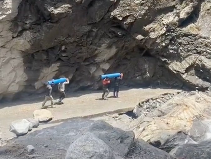 Within the video, which @ushamahato59 uploaded on the platform, you see four men walking against a jaw-dropping backdrop. One of the world’s highest peaks is behind them as they travel across the stony ground, heading under a rock cave.