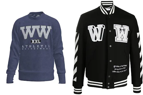 While Virgil Abloh is no stranger to accusations of creative theft, the first thing you’ll notice is that Off-White’s use of Ws is not that similar to Walker Wear’s “WW” mark. Crucially, the two letters aren’t overlapping but placed as two separate chenille patches on the left and white breast.