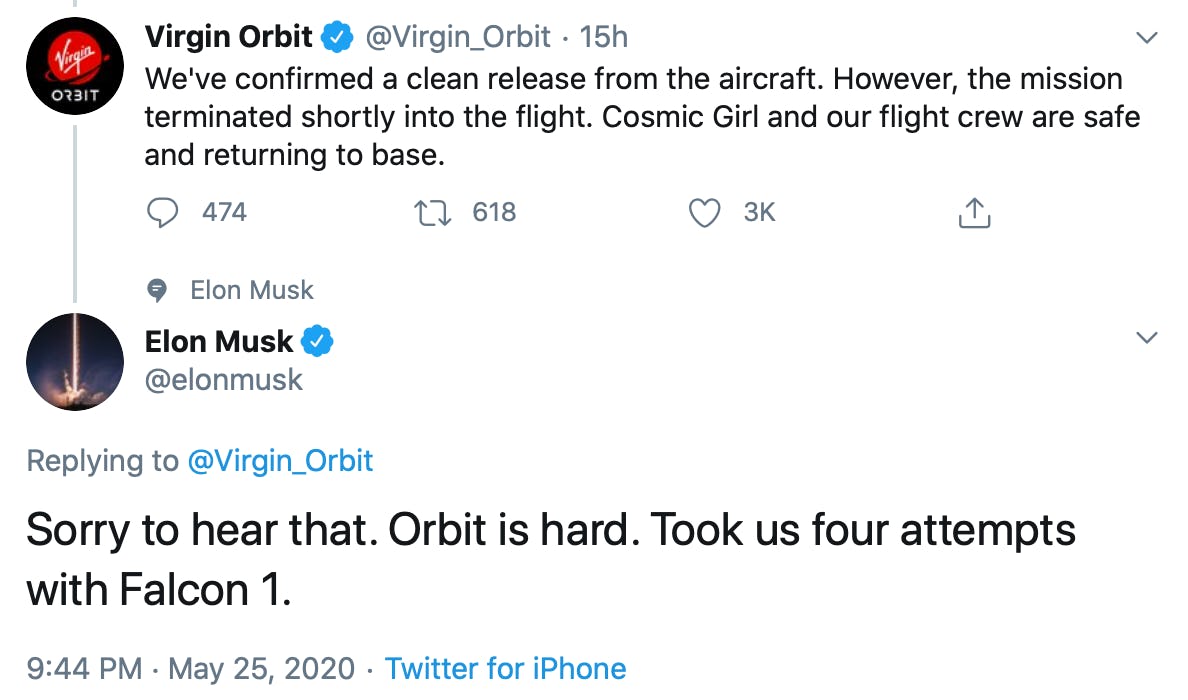 "Sorry to hear that. Orbit is hard. Took us four attempts with Falcon 1."