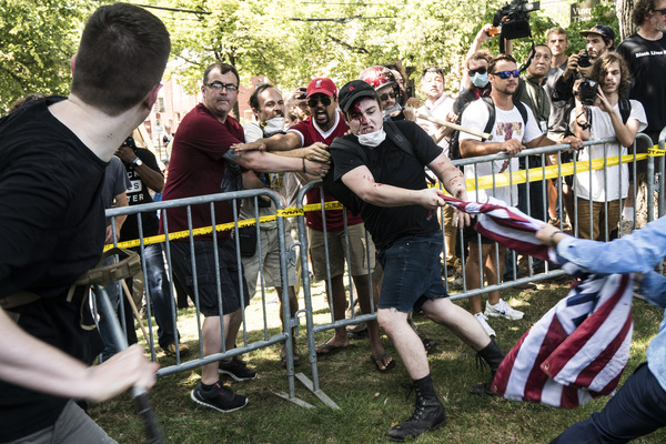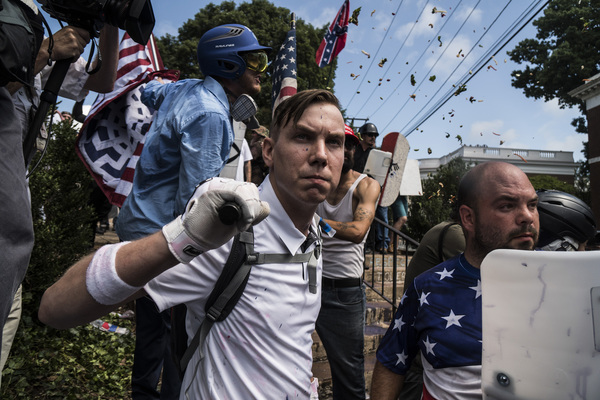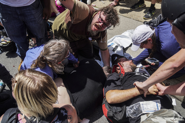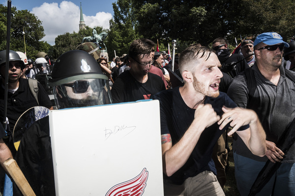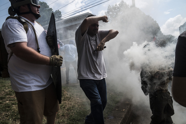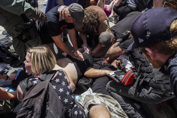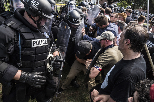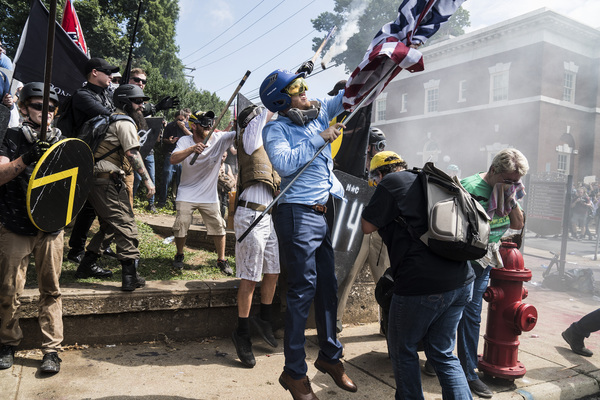 Street brawls broke out Saturday between far-right protesters and anti-racism counter-demonstrators, many of whom carried shields, weapons and Nazi and Confederate battle flags. One woman was killed when a driver plowed a sports car into a crowd of counter-demonstrators.