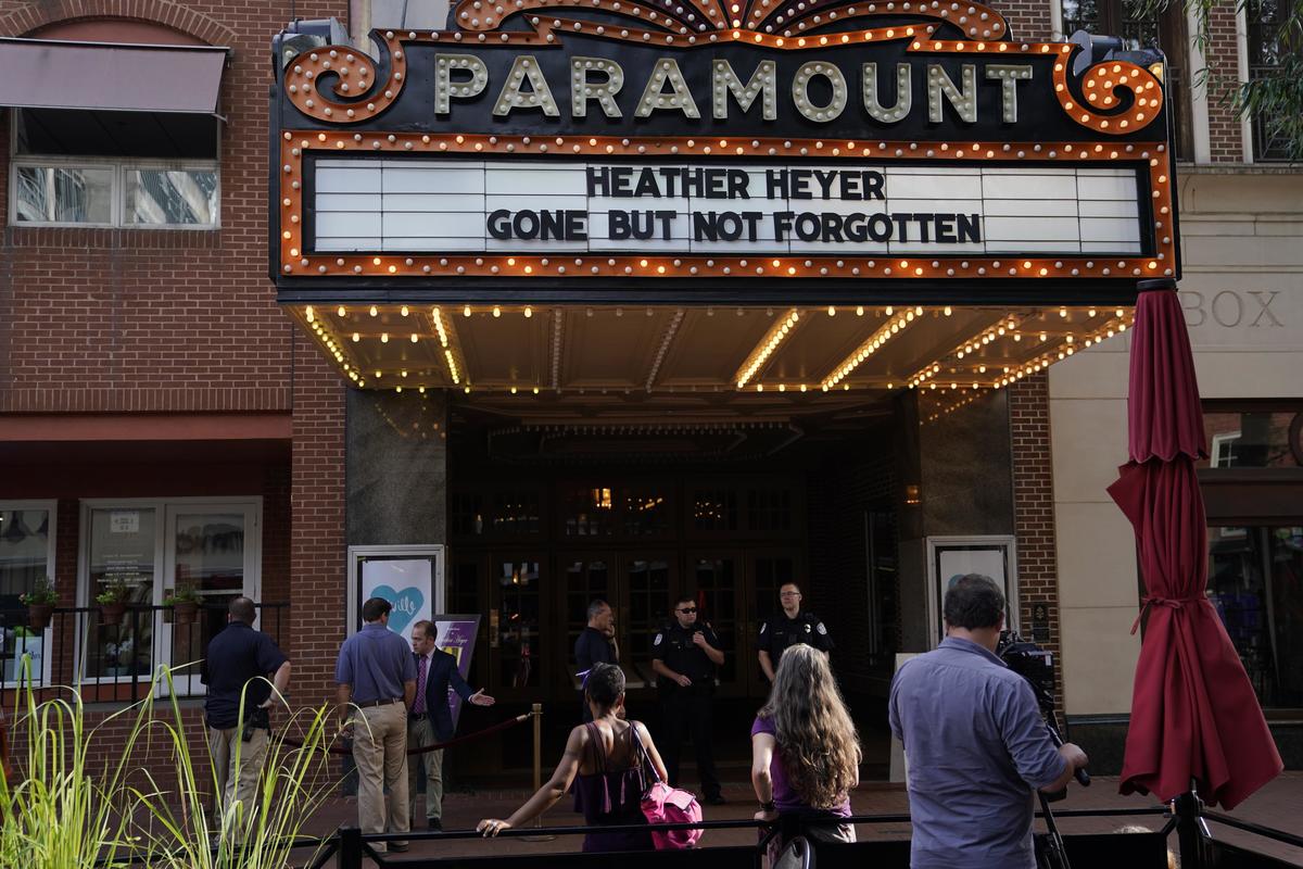 The theatre's marquee outside read: "Heather Heyer, gone but not forgotten."