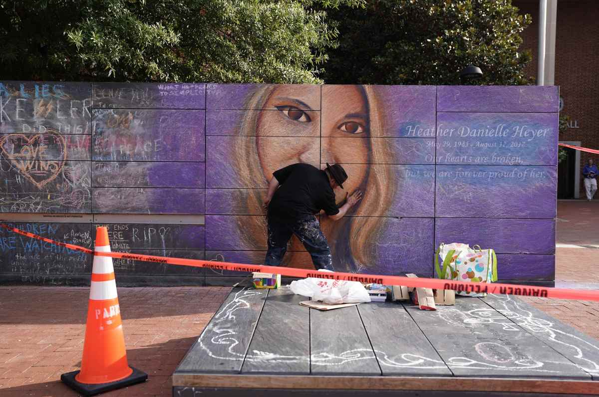 Also outside the theatre, near where Heather Heyer was killed, artist Sam Welty was chalking a large portrait of her on a memorial wall that features many tributes to her.