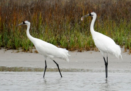 At 5 feet (1.5 meters) high from their black feet to the little red caps on their heads, whooping cranes are the tallest birds in North America. They’re white with black wingtips, and their wingspan, at more than 7 feet (2.1 meters), is wider than a full-sized pickup truck. They mate for life.
