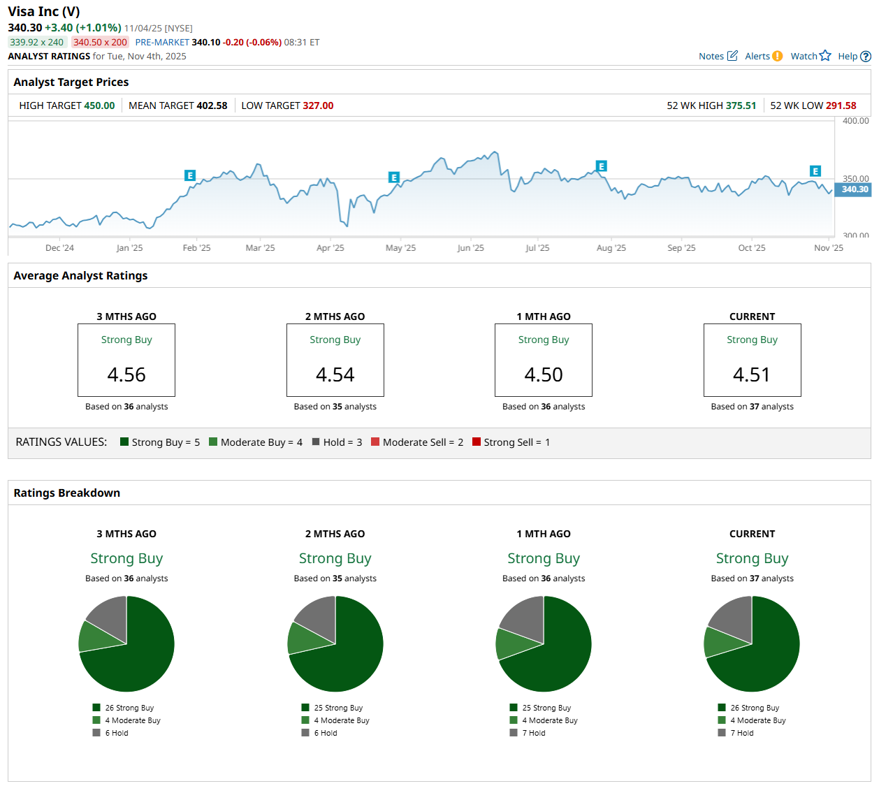 On Oct. 29, Macquarie analyst Paul Golding maintained a "Buy" rating on Visa and set a price target of $410, indicating a 20.5% potential upside from the current levels.
