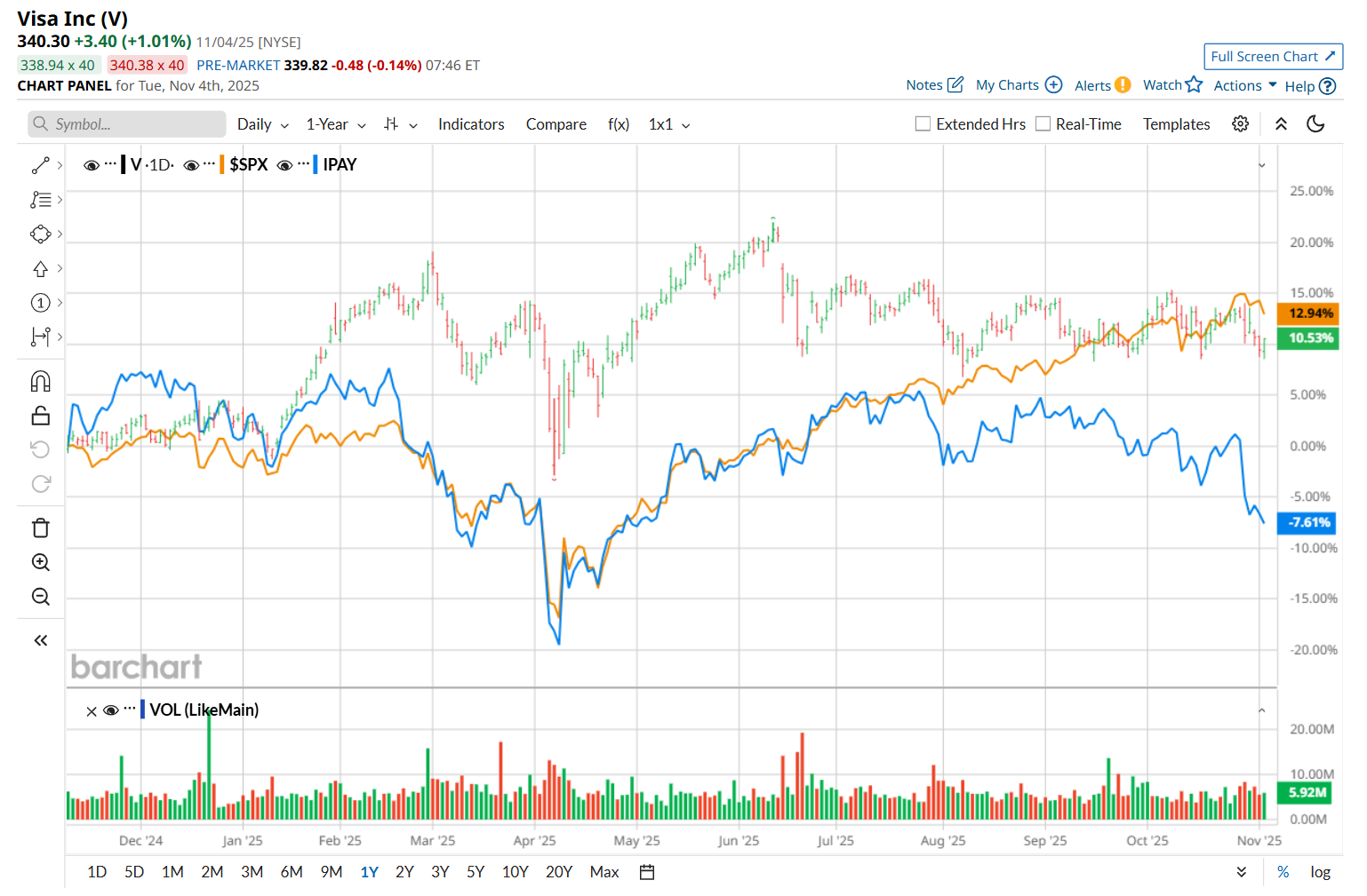 On Oct. 28, Visa delivered better-than-expected Q4 results, yet its shares plunged 1.6% in the following trading session. Due to continued healthy consumer spending, the company's net revenue improved 11.5% year-over-year to $10.7 billion, surpassing consensus estimates by a slight margin. Meanwhile, its adjusted EPS of $2.98 increased 10% from the year-ago quarter, topping analyst expectations by a penny. However, its total operating expenses surged by a notable 40% from the prior-year quarter, outpacing revenue growth, which led to a noteworthy decline in operating margins, making investors jittery.