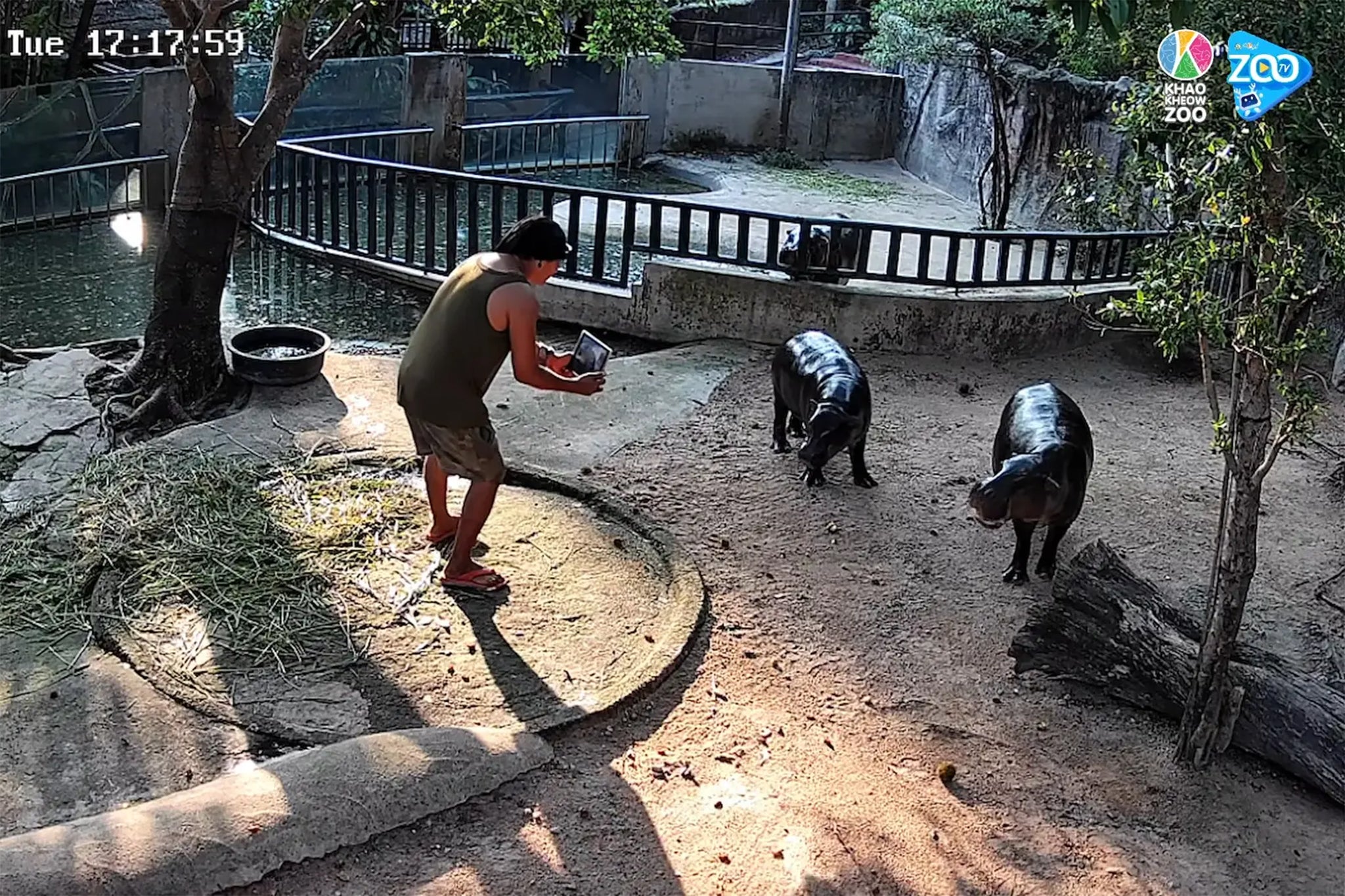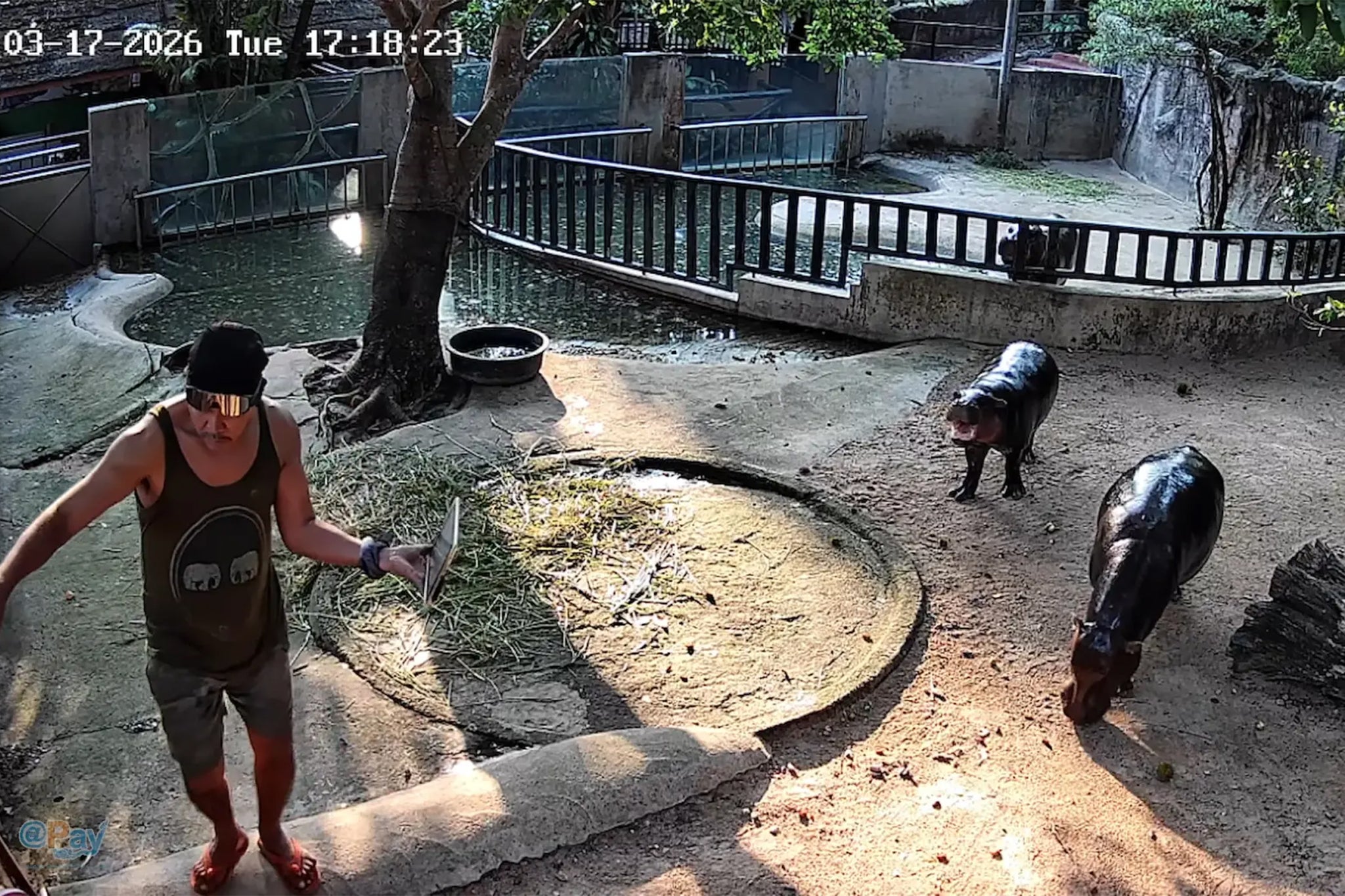 Security footage that has been widely circulated online shows a man in a black beanie, sunglasses, green tank top, and brown shorts approaching Moo Deng and her mother, Jona, while holding a tablet, seemingly recording.