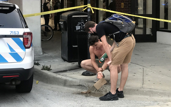 CHICAGO _ Troy Laird used a water bottle from a friend to wash his bloody hands outside the Morse "L" station in Chicago's Rogers Park neighborhood.