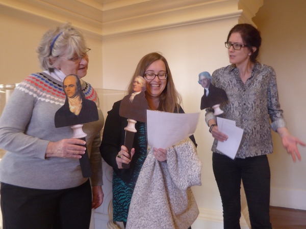 The guide distributes stick puppets of the Founding Fathers, and the nature of their conflict emerges as visitors read excerpts from source documents and lyrics from the musical. Hamilton, an "immigrant, orphan, bastard," believed in the leadership of aristocrats, while Jefferson, an aristocrat, trusted in the people, Light says.