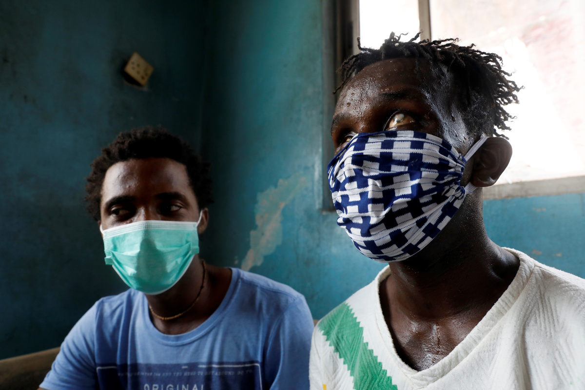 Shobowale Kehinde, 28, an entertainer who is visually impaired, speaks with his friend in his room amid the coronavirus disease (COVID-19) outbreak in Lagos, Nigeria May 5, 2020. REUTERS/Temilade Adelaja