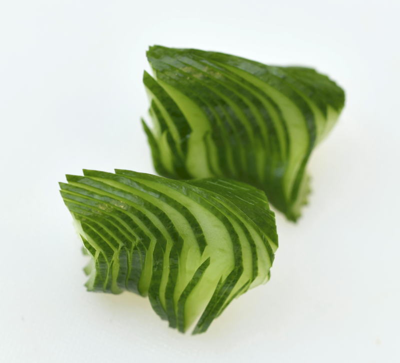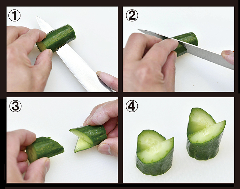 Some decorative cutting techniques can also be tried at home. Hasegawa showed how to cut a cucumber to top with miso or wasabi.