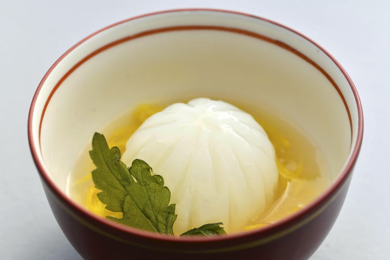 Hasegawa peeled a turnip and made some slits lengthwise to resemble a chrysanthemum. "Pouring a thickened soup over it can make a nice dish," the chef said. "You can add an elegant touch if you garnish the turnip with a deep-fried leaf of edible chrysanthemum."