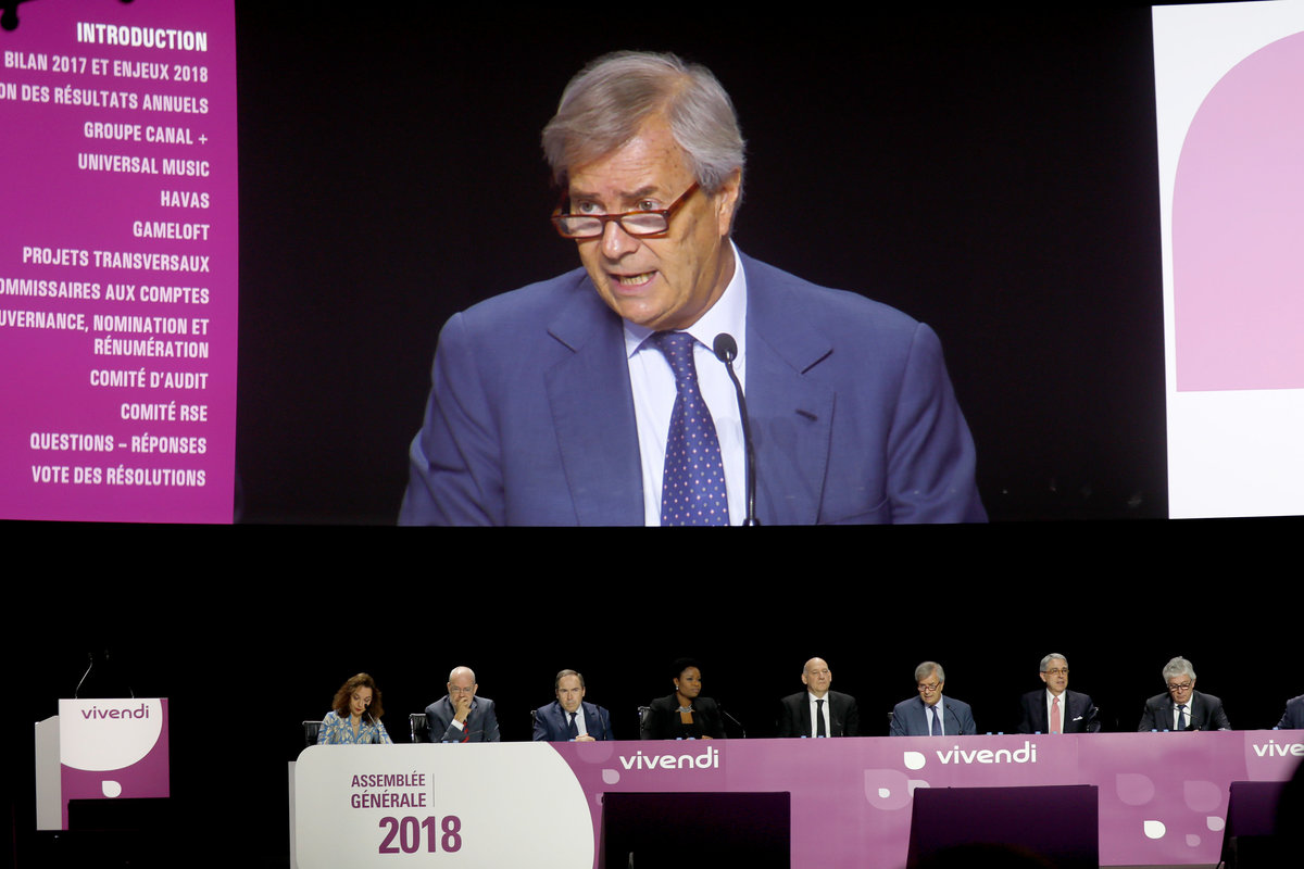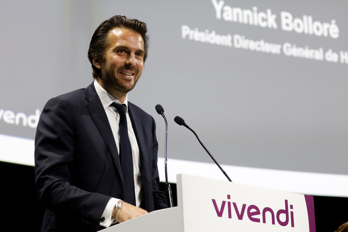 Yannick Bollore, Chairman and Chief Executive Officer of Havas Group, speaks at the media group Vivendi company's shareholders meeting in Paris, France, April 19, 2018. REUTERS/Charles PlatiauVincent Bollore, Chairman of the Supervisory Board of media group Vivendi, takes pictures with his mobile phone while attending the company's shareholders meeting in Paris, France, April 19, 2018. REUTERS/Charles Platiau