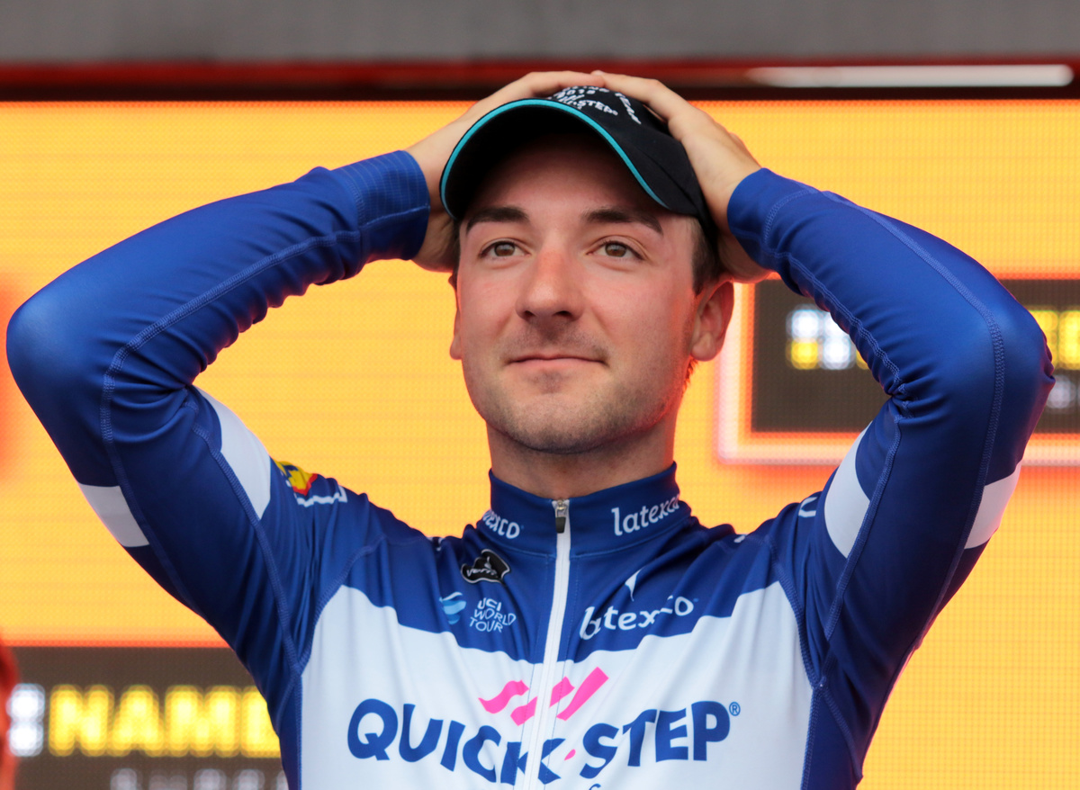 Gaviria left his arms behind his back on the podium, refusing to celebrate.