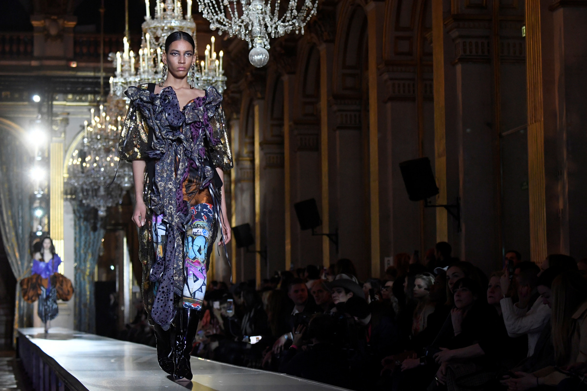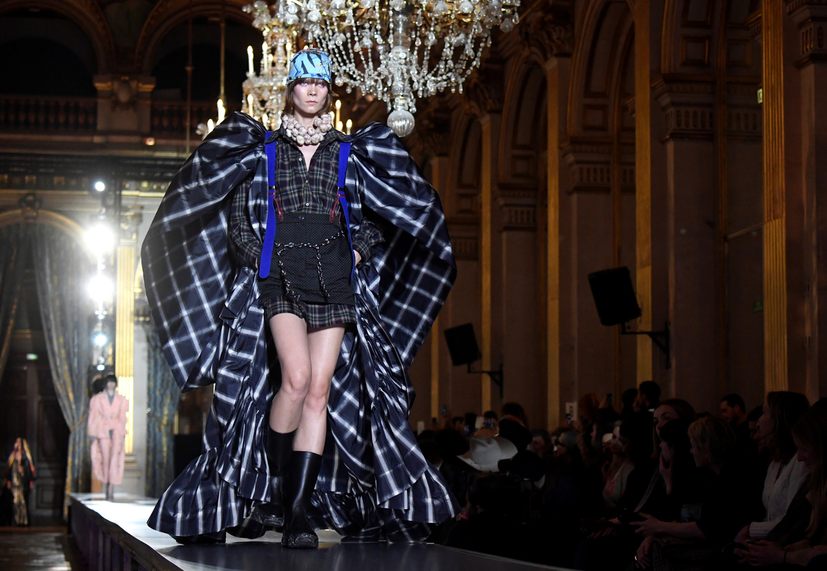 A model presents a creation by designers Vivienne Westwood and Andreas Kronthaler as part of their Fall/Winter 2020/21 women's ready-to-wear collection show during Paris Fashion Week in Paris, France February 29, 2020. REUTERS/Piroschka van de Wouw