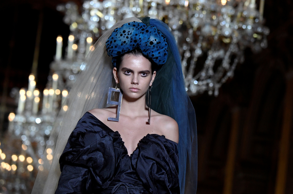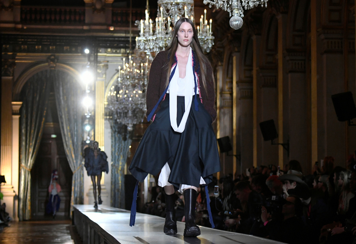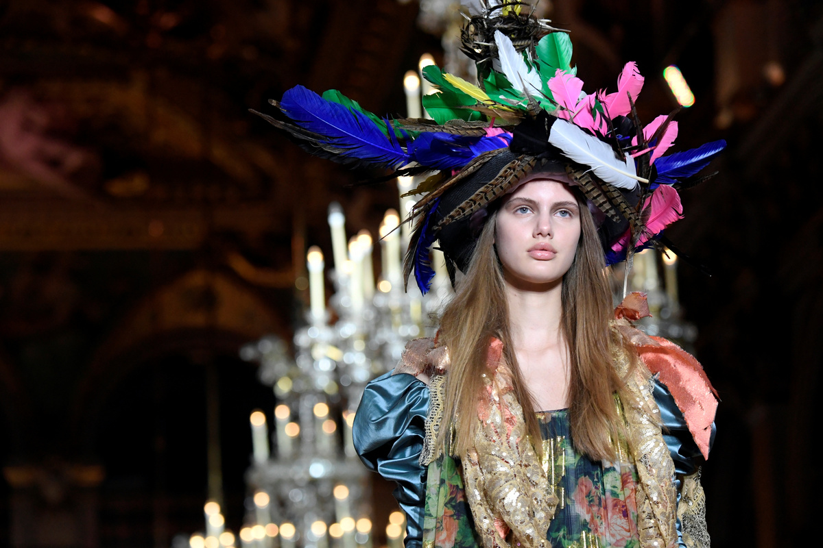 Contrasting the opulence of the French capital's Hôtel de Ville, models in long skirts and oversized coats looked like peasants with necklaces of garlic or pepper tresses and the occasional multi-colored feather hat to top it all off.