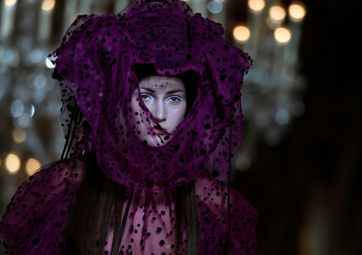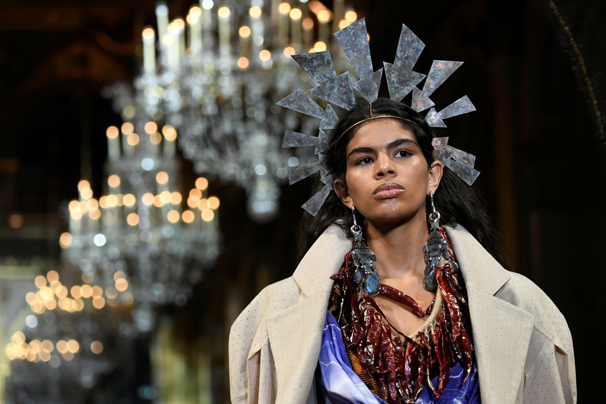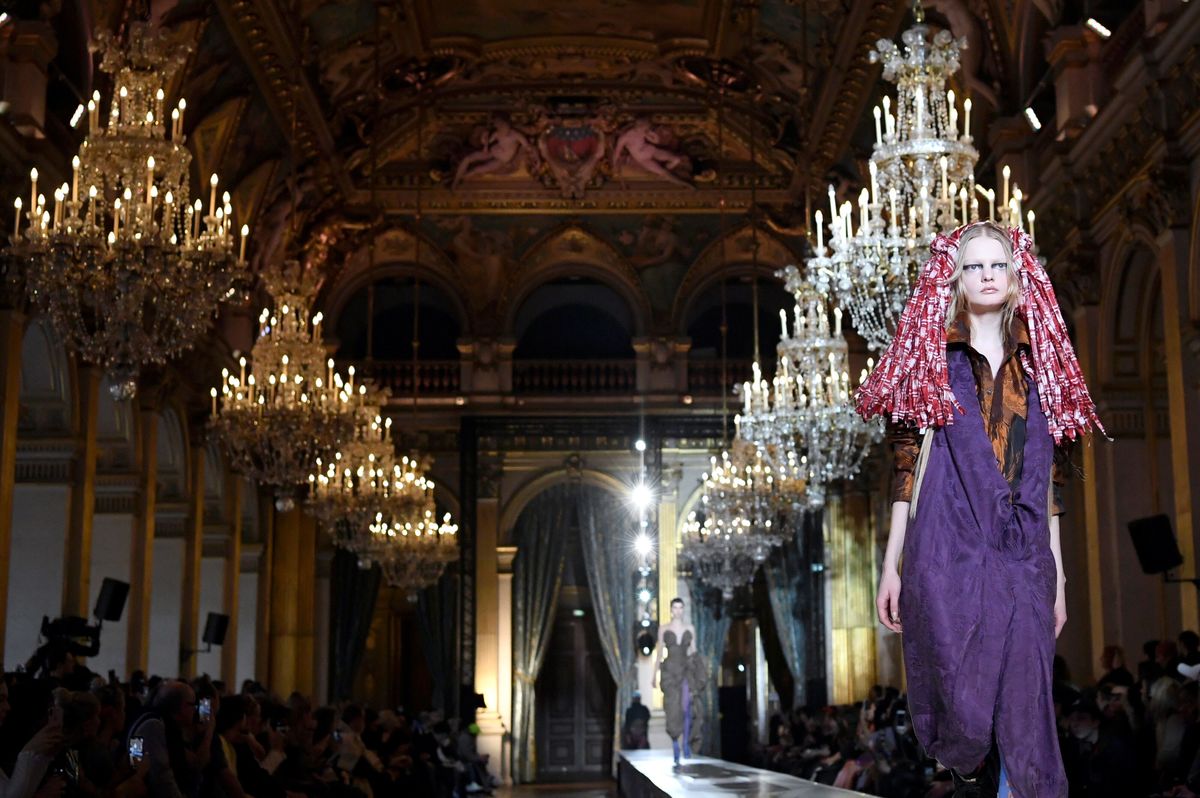 Austrian-British fashion duo Andreas Kronthaler and Vivienne Westwood brought a gypsy-like caravan of models wrapped in tartan and silk to the gilded corridors of Paris' town hall to present their 2020-21 winter collection.