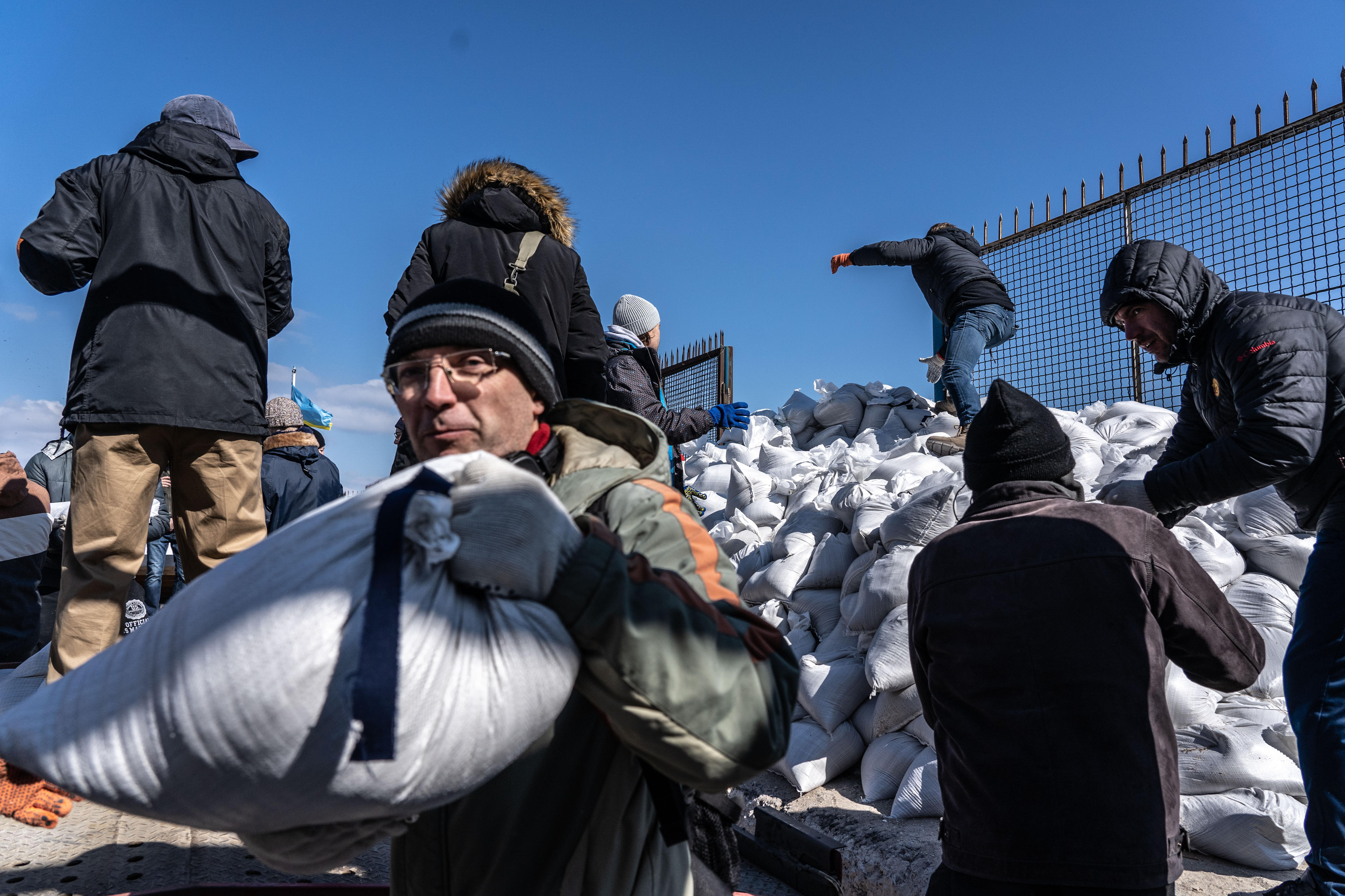 The sandbags form the building blocks of the barricades that can slow or cushion the potential spray of bullets and shrapnel.