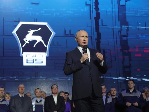Mr Putin, 65, who this year passed Leonid Brezhnev’s record of 6,602 days in office, has placed the future at the centre of his now official campaign pitch. If he completes the next term in full, he will de facto have ruled Russia for 24 years. Both figures include an interregnum between 2008 and 2012, when Dmitry Medvedev was notionally in charge as President and Mr Putin served as his Prime Minister.
