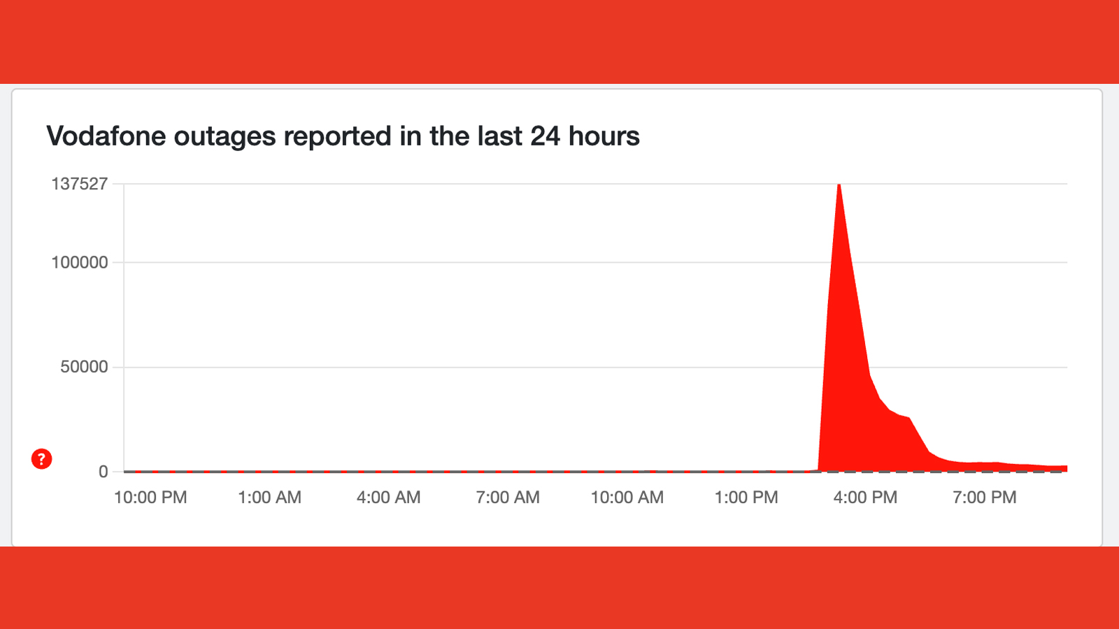 The issues started at around 2.38pm BST, when the website Downdetector showed an enormous spike in reports. At its peak, almost 135,000 Vodafone customers simultaneously reported problems, making it one of the biggest network outages of 2025.
