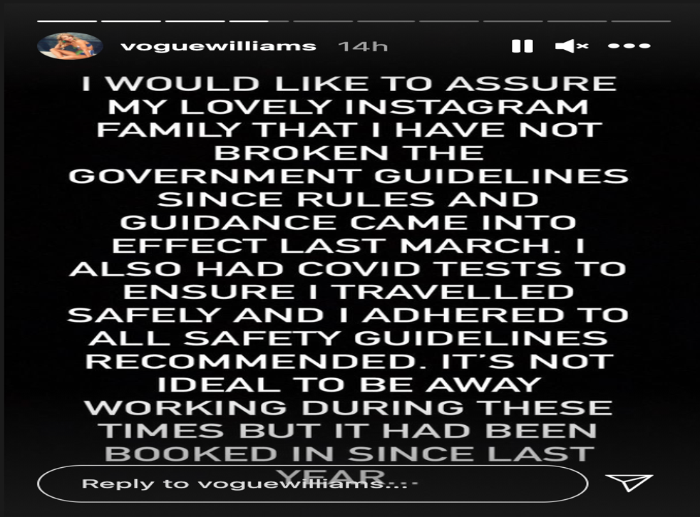 “I would like to assure my lovely Instagram family that I have not broken the government guidelines since rules and guidance came into effect last March,” she wrote.