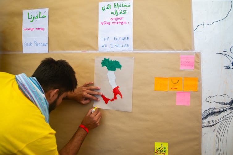 This series of articles draws on a year of research conducted on board the Ocean Viking, the civilian search-and-rescue ship operated in the central Mediterranean by the NGO SOS Méditerranée. It explores the perspectives of exiled people based on testimonies from 110 survivors who were picked up while attempting the crossing from North Africa, as well as crew members’ experiences and the researcher’s creative collaborations on board the ship.