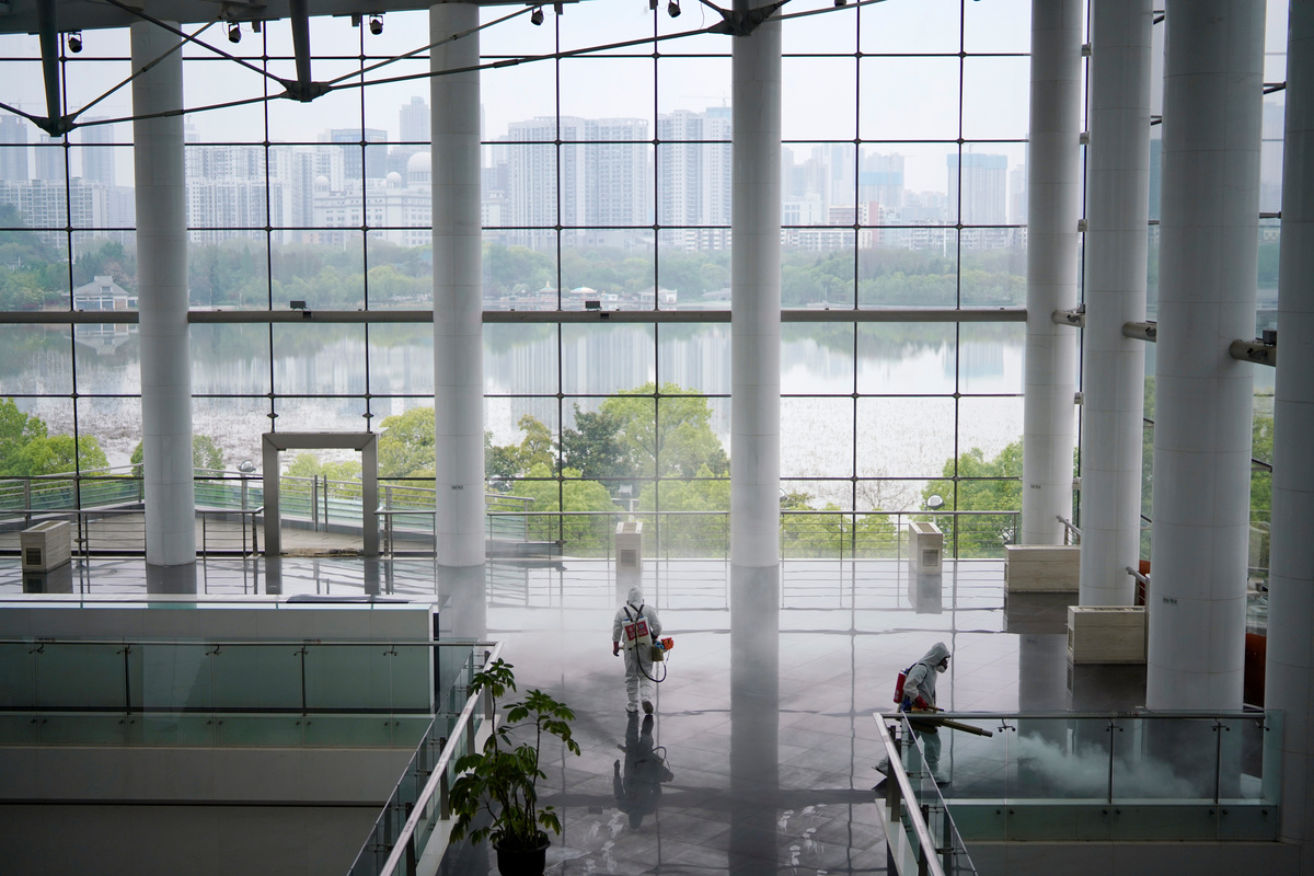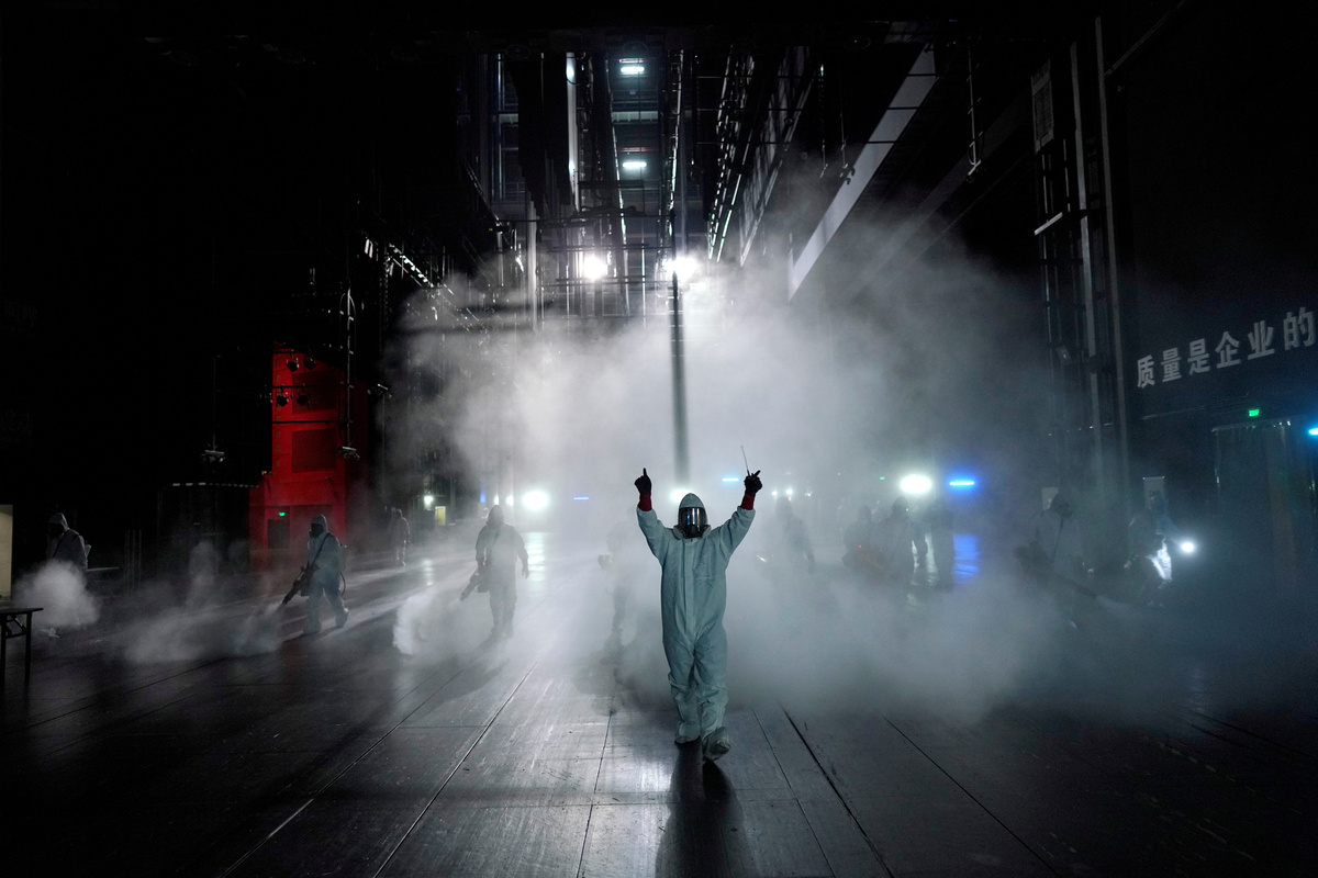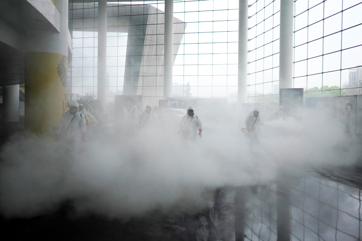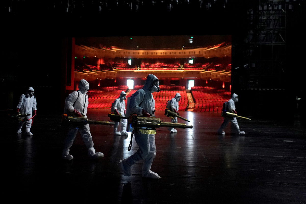 Volunteers from the Blue Sky Rescue team disinfect at the Qintai Grand Theatre in Wuhan, Hubei province, the epicentre of China's coronavirus disease (COVID-19) outbreak, April 2, 2020. Picture taken April 2, 2020. REUTERS/Aly Song