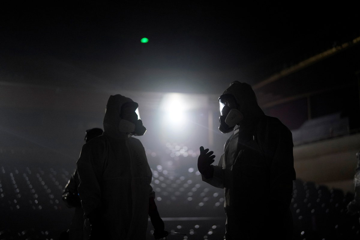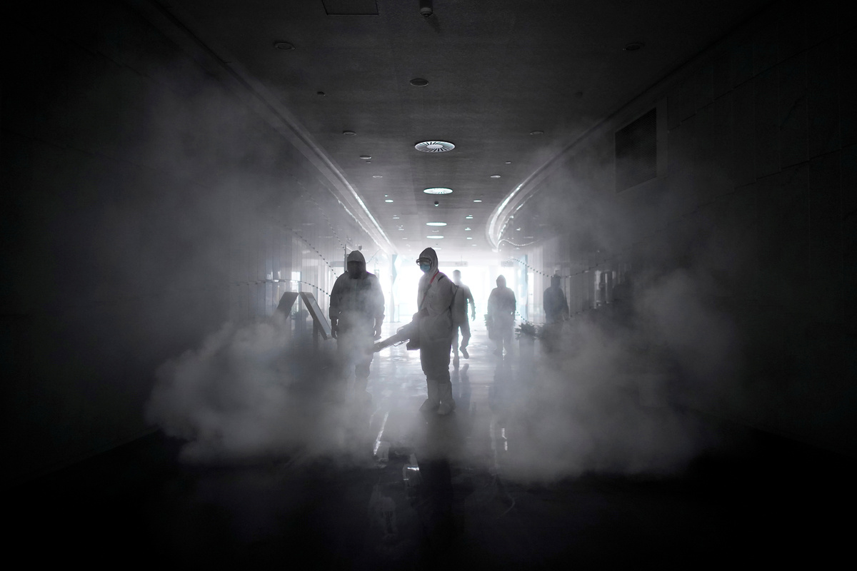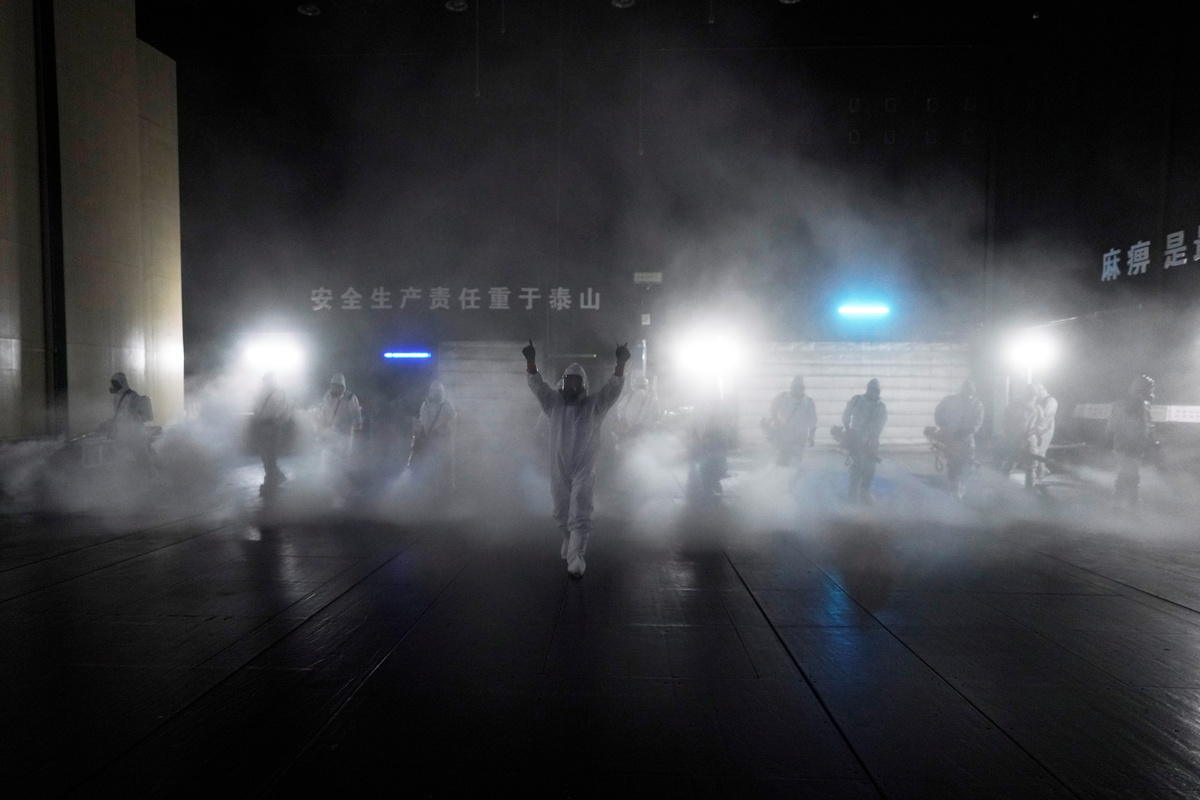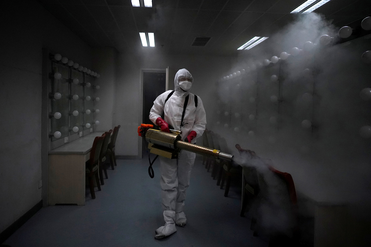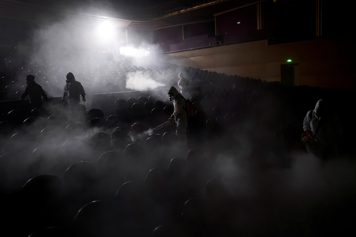 Volunteers from the Blue Sky Rescue team disinfect at the Qintai Grand Theatre in Wuhan, Hubei province, the epicentre of China's coronavirus disease (COVID-19) outbreak, April 2, 2020. Picture taken April 2, 2020. REUTERS/Aly Song