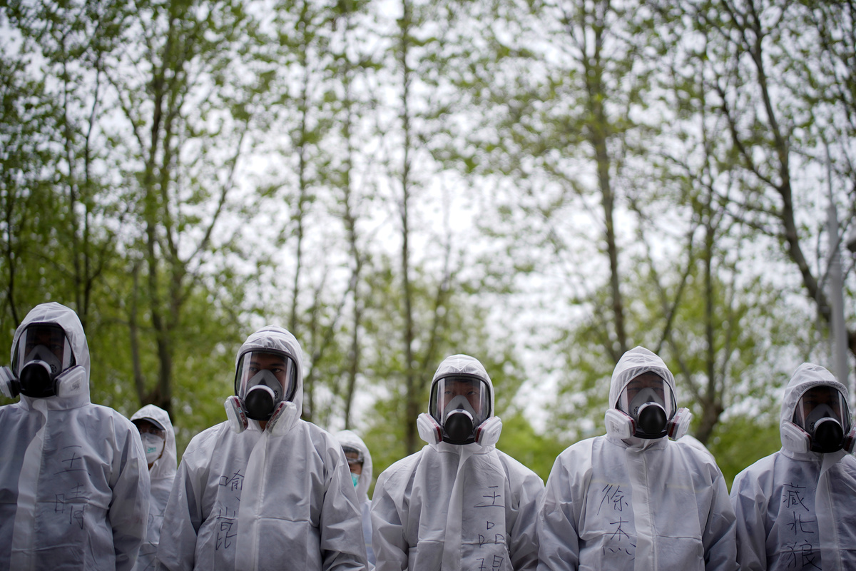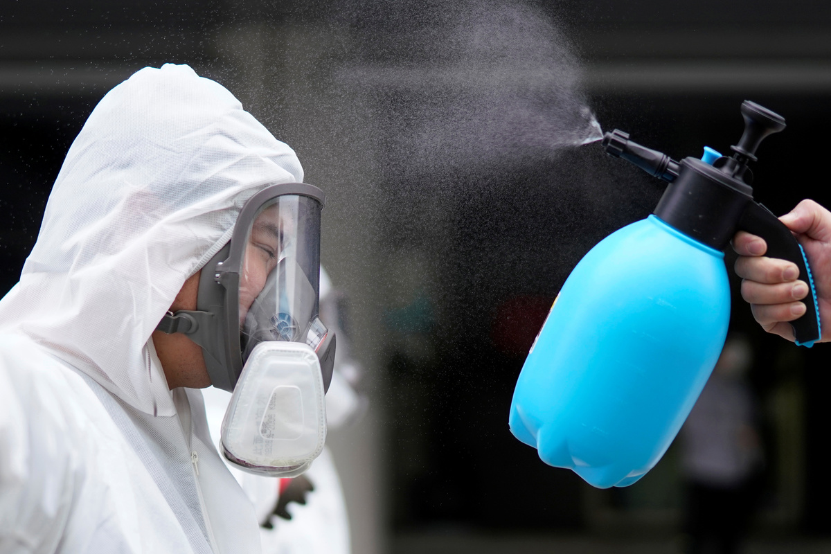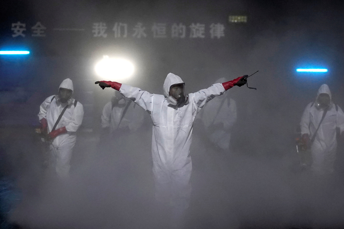 Volunteer disinfectant sprayers help Wuhan prepare for a return to work