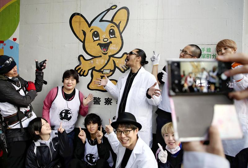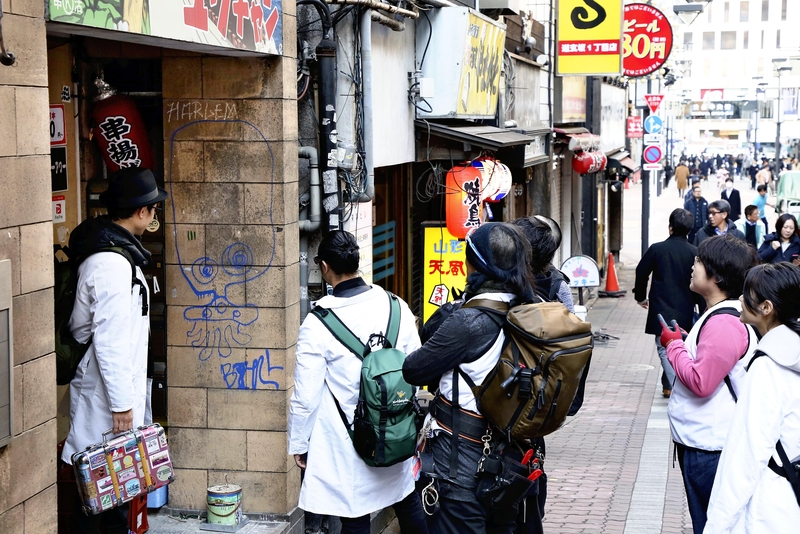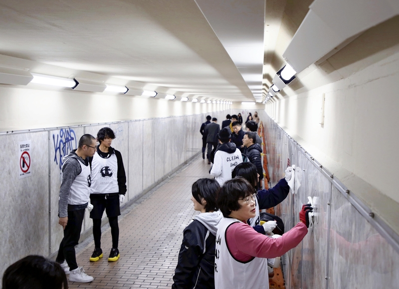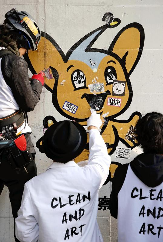 In early December, a group of people were seen working hard under an elevated railway track near JR Ebisu Station in Shibuya Ward, Tokyo, moving their hands against a wall marred by countless stickers and spray-painted scrawls in red, blue and other colors. They held cloths and putty knives in their hands, and all were the same logo on the back of their shirts, saying, "CLEAN AND ART."