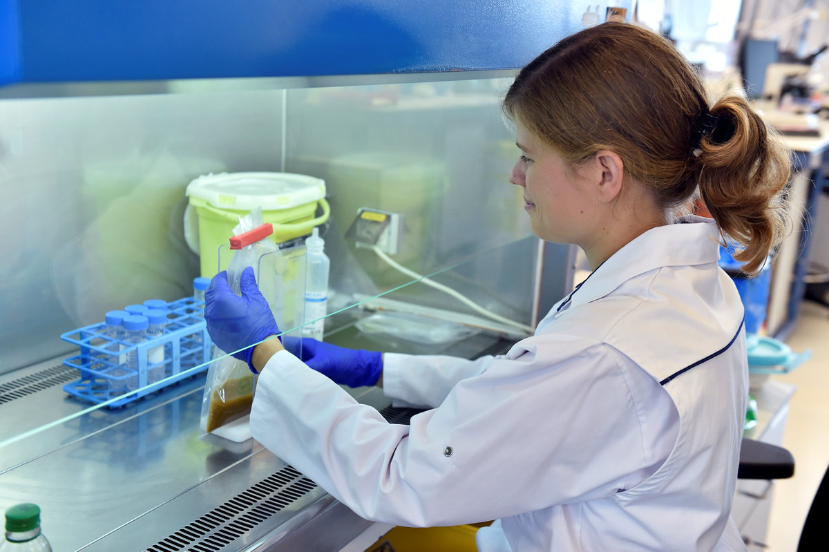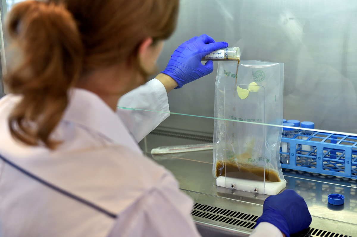 A scientist manipulates a bag that contains faeces in a laboratory at the University of Ghent, Belgium August 23, 2018. The donated faeces will be used to improve the bowel movements of sick patients. Picture taken August 23, 2018. REUTERS/Eric Vidal